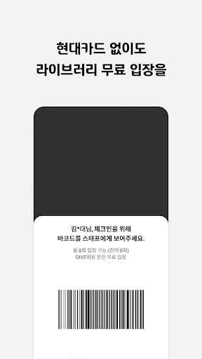 놀면 놀수록 빠져드는 컬처 앱 DIVE · 날마다 업데이트되는 취향 맞춤 컬처 트렌드 정보 · 가장 먼저 확인하는 슈퍼콘서트 등 현대카드 컬처 행사 소식 · 에어비앤비, 무신사 등 힙한 브랜드와 함께 하는 콜라보 컨텐츠 · 팬 메이드 라이브 등 오직 DIVE에서만 만날 수 있는 Exclusive한 이벤트 · DIVE만 있으면 현대카드 라이브러리 무료 입장 [DIVE 앱 이용을 위한 접근 권한 안내] * 선택 접근 권한은 동의하지 않아도 앱 이용이 가능합니다. * 알람 및 리마인더 접근 권한은 Android 14 이상 버전에서 동의가 필요할 수 있습니다. · 전화(필수) - 본인·기기 인증 · 알람 및 리마인더(필수) - 로그인 세션에 따른 앱 재시작 등의 처리 등 제공 · 저장(선택) - 이벤트 참여, 프로필 사진 및 방문 인증 등록 · 위치(선택) - 위치기반 정보 제공 · 카메라(선택) - 이미지 검색 및 프로필 사진 촬영 · 알림(선택) - 예약확인, 이벤트 당첨알림 정보, 관심 콘텐츠 추천 * 안드로이드 5.0 버전 이상에서 이용 가능 * 앱 사용 오류 문의: DIVE@hcs.com