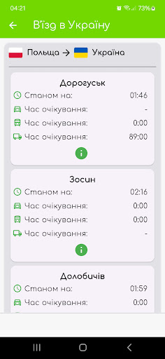 Додаток створений для зручності отримання інформації щодо завантаженості пунктів пропуску із сусідніми державами. Для більшості пунктів пропуску доступно відображення наступних даних: - Кількість пішоходів(якщо даний пункт пропуску здійснює пропуск пішоходів) - Кількість легкових авто перед вибраним пунктом пропуску - Кількість вантажних авто перед вибраним пунктом пропуску - Кількість автобусів перед вибраним пунктом пропуску - Для вантажних авто та автобусів відображається інформація про те, чи дана черга затримується - Можливість відкрити телеграм канал обраного пункту пропуску - Перегляд і можливість подзвонити черговому працівнику обраного пункту пропуску Дисклеймер: Автор додатку не є предстаником державних органів, а тільки використовує дані надані Державною прикордонною службою. Дані щодо виїзду з України надані Західним регіональним управлінням Держприкордонслужби України та сайтом електронної черги для перетину кордону: https://dpsu.gov.ua/ua/map та https://echerha.gov.ua/en/workload. Дані щодо в\їзду в Україну отримані з сайту польської прикордонної служби: https://granica.gov.pl/index_wait.php?p=u&c=t&v=en