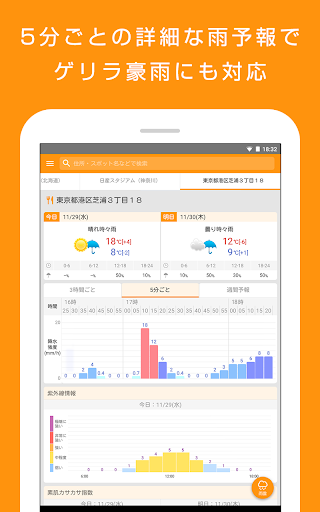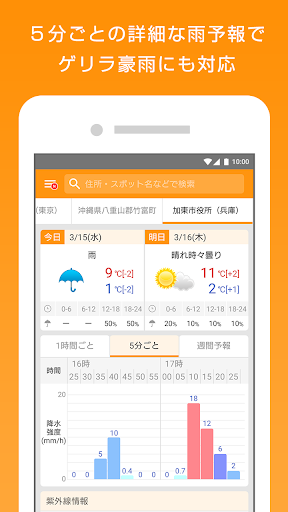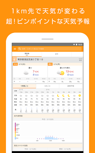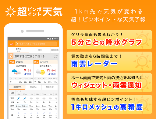 マピオン超ピンポイント天気のおすすめポイント ・市区町村より細かい!1km四方の天気予報 ・5分ごとの降水グラフで突然の雨も丸分かり ・雨雲レーダーで6時間先までの雨雲の動きがわかる ・雨雲の接近をお知らせ!突然の雨にも慌てない ・アプリ起動なしで天気がわかる!便利なウィジェット ・地図からスポットが探せる!多彩なスポット検索機能 ・お気に入りスポット登録は100件までOK ※一部プレミアム会員限定の機能です ***主な機能*** ------------------------- ■天気予報 - 細かいエリアのピンポイント天気予報 無料版:市区町村ごと プレミアム会員:1km四方ごと - 今日・明日・明後日の天気予報が見られます 無料版:3時間ごとの天気予報 プレミアム会員:1時間ごとの天気予報 - 現在地の天気予報が見られます - 週間天気予報が見られます [予報範囲] 無料版:市区町村ごと プレミアム会員:1km四方の超ピンポイントなエリア(標高も考慮されます) [更新時間] 無料版:1日3回(6時、12時、18時)に発表 プレミアム会員:1日24回(1時間ごと)に発表 [掲載情報] 1日ごとの天気: - 今日・明日の天気予報 - 最高気温/最低気温(前日差) - 降水確率 1時間ごと/3時間ごとの天気: - 天気予報 - 最高気温/最低気温 - 降水量 - 湿度 - 風向・風速 週間天気予報: - 天気予報 - 最高気温/最低気温 - 降水確率 - 日の出・日の入時刻 - 月の出・月の入時刻 - 月齢 ■5分ごとの降雨強度グラフ - 5分ごとの降雨強度を1時間先までグラフで表示 突然の雨がいつ降り出すのか、 今降っている雨がいつ止むのかが一目でわかります ※プレミアム会員のみ ■雨雲レーダー - 過去から未来の雨雲も動きと降水量がわかります 無料版:1時間前から10分後まで プレミアム会員:1時間前から6時間後まで - スポット検索で知りたいエリアに簡単に移動できます ■天気予報の通知 - 今日・明日の天気予報を通知できます ※1分単位で通知時刻を設定できます - 現在地の天気(通知時刻にいる場所)を通知できます 旅行中など、普段とは異なる場所にいる際に便利にご活用いただけます ■雨雲の通知 - 雨雲の接近をお知らせします - 通知間隔を設定できます 無料版:雨が降りだす1時間前 プレミアム会員:5分前・15分前・30分前・45分前 - おやすみモードで夜間の通知を停止できます ※1分単位で停止時刻を設定できます - 現在地の雨雲(通知時刻にいる場所)を通知できます 旅行中など、普段とは異なる場所にいる際に便利にご活用いただけます ■ウィジェット - アプリを起動せずに、簡単に天気予報を確認できます - 好みに合わせてデザインを選択できます [お天気ウィジェット] - 1日ごとの天気を表示します - 1日分・2日分・4日分の3種類から選択できます - 6種類のデザインから選択できます [24時間天気ウィジェット] - 1時間ごとの天気を24時間後まで表示します ※無料版は3時間ごと - 週間天気予報を表示します - 2種類のデザインから選択できます [降水グラフウィジェット] - 1時間以内の雨の強さを5分ごとに表示します - 1時間ごとの降水量を8時間後まで表示します - 2種類のデザインから選択できます ※プレミアム会員のみ ■紫外線情報 - 今日・明日の紫外線の強弱をグラフで表示 ■素肌カサカサ指数 - 今日・明日の素肌のカサつきレベルで5段階で表示 ■スポット検索 - 市区町村以下、丁目・番地まで指定して検索 - 住所が分からなくても地図をタップで簡単検索 - 「山」や「温泉」「ゴルフ場」等、ジャンルから検索 - フリーワード検索も可能です ■スポット登録 - よく見るスポットを100件まで登録できます ※無料版は8件まで - スポット名称を編集できます ※プレミアム会員のみ - 自宅や会社など25種類のアイコンが選択できます [注意事項] ・1時間毎の天気で表示される風速の値は、気象数値予報の計算結果を表示したもので、実際の値とは大きく異なる可能性があります。 ・小笠原諸島では直近6時間の天気予報が表示されませんので、あらかじめご了承下さい [位置情報の利用について] 本サービスでは現在地および地図の精度を向上させ、サービスの利便性を図る目的と広告をサポートするために位置情報等を取得しますが、取得する情報には個人を特定する情報は含まれておらず、また、当社がこれらを個人を特定する目的で利用することはありません。ご安心ください。 株式会社ONE COMPATH(ワン・コンパス)個人情報の取り扱いについて 株式会社ONE COMPATH(ワン・コンパス)利用規約 [ご意見・ご要望について] よりよいサービスを目指すため、皆様のご意見・ご要望をお待ちしております アプリを起動し、設定メニュー内の「お問合せ」よりご連絡ください [お問い合わせについて] 土日、祝祭日、年末年始、弊社休日はお休みさせていただきます。 GWや年末年始などの連続休業後は、お返事までに数日以上のお時間をいただく場合がございますので予めご了承ください。
