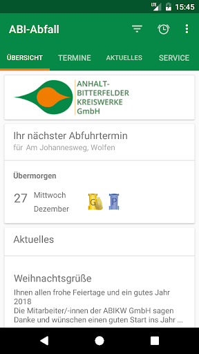 Die Abfuhrtermine aller im Landkreis Anhalt-Bitterfeld vorgehaltenen Sammelsysteme sind über diese kostenlose App der ANHALT-BITTERFELDER KREISWERKE GmbH verfügbar. Kompatibel mit allen aktuellen Android-Versionen, einschließlich Android 8 (Oreo). Ein Blick auf die ABI-Abfall App gibt Auskunft, wann der Restabfallbehälter und die Biotonne entleert werden, wann der Gelbe Sack abgeholt oder die Gelbe Tonne entleert wird und wann das Schadstoffmobil in Ihrem Wohnort hält. Der Wohnort wird bei Inbetriebnahme der App einmalig eingestellt (kann aber bei Bedarf auch jederzeit verändert werden). Lassen Sie sich an die bevorstehenden Abfuhrtermine erinnern, damit Sie keinen Termin mehr verpassen. Die App bietet außerdem Aktuelles von der Website der ABIKW sowie den direkten Zugriff zum Kontaktformular und anderen viel nachgefragten Informationen zur Abfallentsorgung im Landkreis Anhalt-Bitterfeld.