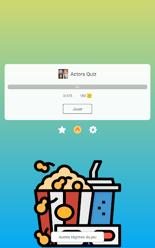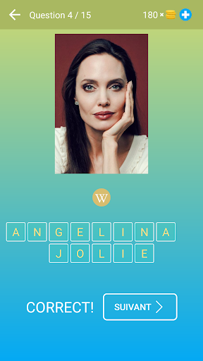 Ce jeu est destiné aux vrais cinéphiles! Devinez près de 550 acteurs et actrices hollywoodiens célèbres et prouvez à tous que vous êtes l\expert du cinéma mondial. Ouvrez les 35 niveaux, jouez à des mini-jeux supplémentaires, participez à des modes compétitifs et prenez la première place dans les classements de jeu et complétez le quiz à 100%. Cette application mobile vous aidera non seulement à rafraîchir vos connaissances du cinéma, mais aussi à découvrir des acteurs et actrices talentueux jusque-là inconnus. En plus des niveaux principaux, l\application dispose de 12 packages avec des questions. Parmi eux: acteurs hollywoodiens dans l\enfance, réalisateurs, vieux acteurs d\Hollywood, acteurs indiens. Modes de jeu En plus du mode principal, il y a 3 mini-jeux dans le quiz. Arcade. Ici, vous devez deviner la célébrité à partir de la photo, en ouvrant le moins de parties possible de l\image. Devinez l\acteur de la photo. En une minute, vous devez deviner autant de stars de cinéma que possible. Vrai / faux. Faites correspondre la personne sur la photo avec son nom et répondez vrai ou faux. Vous pouvez également rivaliser avec vos amis et d\autres joueurs du monde entier. Accumulez des points, prenez les premières places des piédestaux et impressionnez tout le monde avec votre connaissance du cinéma. Si vous voulez simplement vous détendre et passer un bon moment dans les mini-jeux, choisissez le mode gratuit. Fonctionnalités du quiz Un mode de jeu principal et 3 modes de jeu supplémentaires. Près de 550 acteurs et actrices hollywoodiens populaires du monde entier. 35 niveaux passionnants. Bonus quotidiens pour entrer dans le jeu. Il existe différents indices qui vous aideront dans un moment difficile. Vous ne savez pas quel acteur est devant vous? Vous pouvez en savoir plus sur lui en cliquant sur le bouton approprié sous la photo. Le Wikipedia intégré s\ouvrira. Il existe des statistiques pour chaque niveau et l\ensemble du jeu. Affrontez d\autres joueurs dans des modes de jeu supplémentaires. Prenez les premières places dans les classements! Est-ce difficile pour vous de voir la célébrité sur la photo? Cliquez simplement sur l\image et elle s\ouvrira en haute résolution. Ce jeu est destiné aux cinéphiles de tous âges! Il convient aux enfants, aux étudiants et aux adultes - à tous ceux qui s\intéressent à Hollywood et aux stars d\Hollywood. Interface simple et intuitive. Internet n\est pas nécessaire pour le jeu. Jouez où bon vous semble! L\application fonctionne à la fois sur les téléphones et les tablettes. Le quiz est traduit en 15 langues: anglais, français, allemand, italien, espagnol, portugais, russe, néerlandais, tchèque, polonais, roumain, hongrois, suédois, finnois et indonésien. Icon made by photo3idea_studio from www.flaticon.com