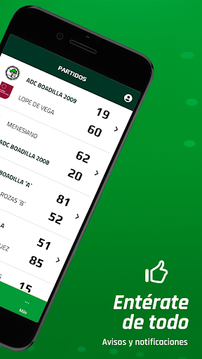 Mantente siempre informado y consulta en cualquier momento la información más importante, tus partidos, equipos y las últimas novedades. Con nuestra app podrás disfrutar de: - Últimas publicaciones - Comentar y compartir - Vídeos - Fotos y álbumes - Partidos: horarios, cómo llegar, resultados, clasificaciones... - Equipos, plantillas, calendarios... - Y mucho más Además podrás recibir avisos y notificaciones en tu móvil con la información más importante y estar siempre al día. ADC Boadilla en todo momento contigo!