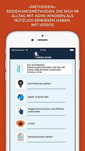 Die App bietet Hilfe im Alltag für Eltern von Kindern mit ADHS. Die App unterstützt Sie mit effektiven Erziehungsmaßnahmen, damit mehr Zufriedenheit ins Familienleben kommt. Wie hilft die App Ihnen und damit Ihren Kindern mit AHDS im Familienalltag? Im ersten Schritt lernen Sie über Videos, Texte und Merksätze konsequente Erziehungsmethoden kennen, um sich und damit Ihrem Kind zu helfen. Im nächsten Schritt geht es um die Umsetzung. Es werden die wiederkehrenden Probleme im Alltag mit dem hyperaktiven Kind beschrieben, die Sie bearbeiten können. Dann werden Erziehungsregeln mit positiven und negativen Konsequenzen definiert. Durch eine Erinnerungsfunktion können sie in das Familienleben integriert werden. Merksätze und Tipps dienen als Unterstützung im Alltag. Über ein Tagebuch werden die Fortschritte dokumentiert. Aufbau der ADHS-Kids App Die App bietet vier Funktionen: Methoden Im Bereich »Methoden« lernen Sie einige Erziehungsmethoden kennen, die sich im Alltag mit hyperaktiven Kindern als nützlich und effektiv erwiesen haben. Prof. Dr. Manfred Döpfner, Universitätsklinik Köln, erläutert in kurzen Filmen die unterschiedlichen Methoden. Diese werden in Merksätzen zusammengefasst, welche Sie individuell ergänzen können. Umsetzung Im Bereich »Umsetzung« können Sie Probleme, die Sie im Familienalltag mit Ihrem Kind haben, angehen. Für 5 häufig auftretende Problemsituationen (Morgenchaos, Mahlzeiten, Hausaufgaben, Geschwisterrivalität und Wutausbrüche) werden sinnvolle Regeln und Konsequenzen vorgeschlagen. Die App bietet zusätzlich die Möglichkeit, individuelle Problemsituation aus dem eigenen Familienalltag aufzunehmen. Ist eine Problemsituation beschrieben, werden Sie Schritt für Schritt angeleitet, die Erziehungsmethoden umzusetzen. Über eine Erinnerungsfunktion, z.B. beim Frühstück, können Sie sich anzeigen lassen, wie Sie sich konsequent verhalten. Tagebuch Im Bereich »Tagebuch« können Sie festhalten, wie gut problematische Situationen an einem Tag gelaufen sind. So können Sie Erfolge verfolgen. ADHS-Fakten Im Bereich »ADHS-Fakten« bekommen Sie die wichtigsten Informationen zu ADHS. Die App lehnt sich an das erfolgreiche Elternbuch »Wackelpeter & Trotzkopf« von Manfred Döpfner, Stephanie Schürmann und Gerd Lehmkuhl an. Prof. Dr. Manfred Döpfner beschäftigt sich seit vielen Jahren intensiv mit der Behandlung von Kindern mit ADHS. Er ist leitender Psychologe an der Klinik und Poliklinik für Psychiatrie und Psychotherapie des Kindes- und Jugendalters der Universität Köln.