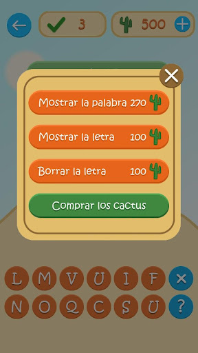 Adivina la Palabra con pistas es un juego de palabras en español que entrena a su mente donde necesita adivinar la palabra en común entre 4 pistas, utilizando las letras dadas. Hazte rico ganando los cactus con cada respuesta correcta. Si no puedes continuar, no te preocupes. Puedes usar ayuda por los cactus. ¿Te gusta juegos de adivinar palabras con pistas? ¿Aceptas el desafío? Caracteristicas ★ Añadimos nuevos niveles regularmente ★ Gran cantidad de cactus al inicio para una ayuda ★ Puede jugar sin conexión en cualquier momento. ★ Logros y tabla de líderes ★ Beautiful gráficos ★ Simple y adictivo juego para tu mente Adivina todas las palabras y estar en la parte superior de la tabla de líderes!