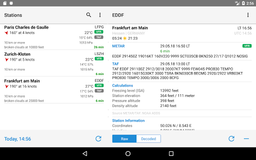 *** AeroWeather: for pilots, aviation enthusiasts, and everyone who is serious about the weather! AeroWeather provides quick and intuitive access to METAR and TAF for airports worldwide. Data can be shown in its original (raw) format or as fully decoded and easy understandable texts. AeroWeather is helpful for weather preflight-briefings, but also to just get very precise weather. All weather data is cached for offline access. There are many settings for units and format of METAR/TAF available. The app features a built-in airport database, which includes basic airport data like runways*, sunrise/sunset, twilight times, timezones etc. Please consult our web-site for a full description of all features. * Additional functionality which needs to be unlocked (one-time purchase). In-app purchases are not transferable between platforms.