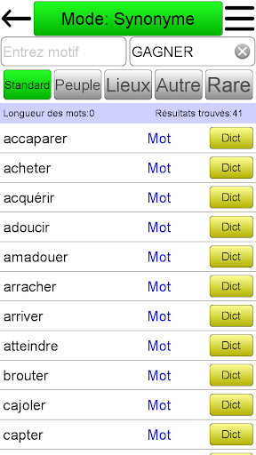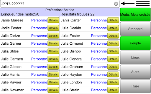 Cette application vous aidera à résoudre les mots croisés français et d\autres jeux de mots similaires. L\application utilise les lettres que vous connaissez déjà pour trouver une liste de réponses possibles. Il présente de nombreux avantages par rapport à des applications similaires: 1) Il contient une liste des noms de milliers de personnes célèbres, de lieux importants, de films, de livres, de personnages de fiction, d\œuvres d\art et plus. Ce sont souvent les réponses aux mots croisés 2) Fournit des filtres pour réduire la liste des réponses possibles. Ceci est essentiel lorsque seules quelques lettres sont connues. Par exemple, vous pouvez filtrer les mots rarement utilisés. 3) Choisissez la langue de la liste de mots, parmi une large gamme de dictionnaires téléchargeables. 36 langues sont actuellement disponibles (voir ci-dessous) 4) Modes pour les mots croisés, les anagrammes, les mots de code et les mots croisés cryptographiques. 5) Résout les réponses \deux mots\. Ceci est très utile en combinaison avec le prénom et le nom de personnes célèbres. Il trouve également des anagrammes de «deux mots» 6) Affichez les réponses dans plusieurs colonnes. Utilisation optimisée de l\espace écran. Profite pleinement de la taille de la tablette 7) Peut être lu en mode portrait ou paysage. Faites simplement pivoter votre appareil et l\affichage s\ajuste automatiquement 8) Le dictionnaire contient également des mots en langue étrangère. Ceux-ci se trouvent souvent dans certains mots croisés. Les mots étrangers sont l\anglais, le français, l\allemand, l\espagnol, l\italien et le latin 9) Contient environ 150000 synonymes, utilisant le thésaurus intégré, pour aider à trouver la solution à partir de l\indice. Toutes ces fonctionnalités sont disponibles sans connexion Internet et sont rarement trouvées dans des applications similaires. Autres fonctionnalités uniques à cette application: - Moteur de recherche facile à utiliser et très rapide. Les réponses possibles s\affichent au fur et à mesure que vous tapez - Très grande liste de mots, divisée en listes communes et rares, pour vous aider à trouver la bonne réponse - Voir la définition détaillée des mots des réponses possibles (connexion Internet requise) - Lien vers la page wiki pour les personnes célèbres, les lieux, les films, les livres, etc. (connexion Internet requise) - L\application peut être téléchargée sur une carte SD Les dictionnaires suivants sont pris en charge: anglais, français, allemand, espagnol, portugais, italien, néerlandais, suédois, danois, norvégien, finnois, polonais, hongrois, tchèque, russe, arabe, bulgare, croate, grec, indonésien, roumain, serbe, serbo-croate, slovaque, slovène, turc, ukrainien, afrikaans, albanais, azerbaïdjanais, estonien, letton, lithuanien, catalan, galicien, tagalog