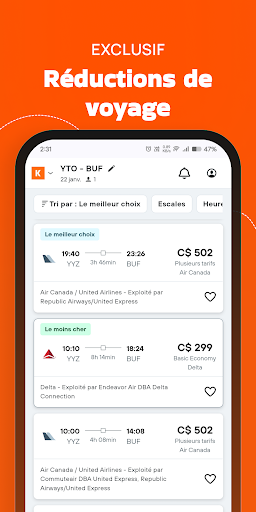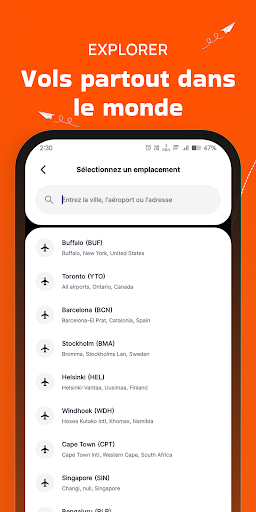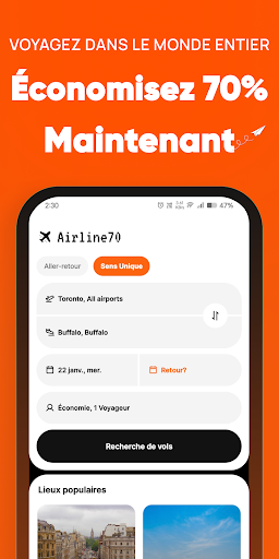 Bienvenue à Airlines70: Vols bon marché - Votre compagnon de réservation de billets d’avion ultimes ! Fatigué de passer des heures à chercher les meilleures offres de compagnies aériennes ? Nous l’obtenons. C’est pourquoi nous avons créé Airlines70, votre application à guichet unique pour tous vos besoins de réservation de vols bon marché. Airlines70 élimine le stress de la réservation de billets d’avion, vous aidant à trouver et à réserver des vols bon marché en quelques secondes en comparant les principaux fournisseurs de réservation de vols comme Hopper, Flighthub, Edreams, Skyscanner, Kiwi, Kayak, CheapOair, Cheap flights, Tripit, Make my trip, Wego, Trip com, Momondo, etc. Réservez vos vols de dernière minute en quelques clics. Pourquoi choisir Airlines70: Vols bon marché ? ️ Réservation airtickets sans effort : Recherchez, comparez et réservez facilement les meilleures offres de billets d’avion de dernière minute à partir d’une vaste sélection des meilleures compagnies aériennes. Notre interface conviviale garantit une expérience de réservation de vol sans tracas pour les réservations de billets d’avion. Couverture mondiale des compagnies aériennes bon marché : Airlines70 couvre un large éventail de destinations, vous connectant à toutes les compagnies aériennes les mieux notées au monde. Que vous planifiiez à l’avance ou que vous recherchiez des options de vols de dernière minute, nous avons ce qu’il vous faut. Offres de vol exclusives : Débloquez des offres et des remises exclusives pour les compagnies aériennes à bas prix sur les vols, en vous assurant d’obtenir les meilleurs prix pour votre voyage. Économisez gros avec Airlines70 : Les réservations de vols bon marché de Tous les billets de vol. Mises à jour en temps réel : Restez informé avec des mises à jour en temps réel sur l’état du vol, les changements de porte, etc. Nous vous tenons au courant, surtout lorsque vous êtes à la recherche d’une réservation de billets d’avion. Options flexibles : Choisissez parmi des options de réservation de vol flexibles et personnalisez votre voyage. Airlines70 répond à vos besoins de voyage, offrant des options pour la réservation de vols de dernière minute et bon marché. Le meilleur billet d’avion offre toutes les compagnies aériennes telles qu’Air Canada, Westjet app, Sunwing, Air Transat, Indigo, United Airlines, American Airlines, Flair airlines, Delta airlines, Air France, Porter airlines, Ryanair, Lufthansa, Emirates, British Airways, KLM, et bien plus encore. Téléchargez Airlines70: Vols bon marché maintenant et découvrez la différence. Avec nos offres de vol imbattables, nos réservations d’airtickets bon marché sans effort pour les compagnies aériennes et nos fonctionnalités pratiques, Airlines70 vous aidera à voler plus intelligemment et plus loin. Alors faites vos valises, réservez vos compagnies aériennes à bas prix et préparez-vous à explorer le monde avec Airlines70 !