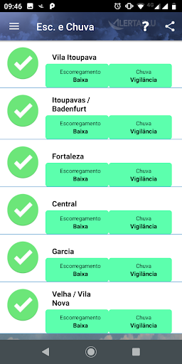O Aplicativo ALERTABLU traz informações sobre o Rio Itajaí-Açu, chuvas e cheias em tempo real. Este aplicativo conta com diversas funcionalidades, tais como: acompanhamento do nível do rio e seu estado de vigilância (atenção, alerta e prontidão). Caso o nível do rio esteja em estado de prontidão, o sistema passa a mostrar a previsão do nível para a próxima hora. Além disso, é possível cadastrar locais para monitorar e se o local estiver com sua cota dentro da previsão no nível, o aplicativo emitirá um alerta ao usuário avisando sobre a previsão. Também há alertas de mudanças no clima e escorregamentos. Funcionalidades: Confira informações sobre o Rio, enchentes, cotas, previsão de tempo e temperatura. Acompanhe as chuvas nas estações, em várias regiões de Blumenau. Consulte telefones, Emails e contatos da Prefeitura e emergenciais. Registre uma ocorrência de Defesa Civil, informe a geolocalização e envie uma foto. Você pode pesquisar Abrigos e o mais próximo pelo GPS do celular, traz numa listagem a distância em metros, telefone clicável e link no Google Maps. Receba Avisos Meteorológicos com informações emergências das chuvas das próximas horas. Condições de Chuva e Probabilidade de Escorregamento listados por Regiões, com estado descritivo e cores de acordo com os seus níveis. Notificações de Trânsito - Informações sobre engarrafamentos, e o estado do Trânsito em Blumenau. Novo layout, mais bonito e funcionalidades com melhor facilidade de uso. Políticas de Privacidade: https://blumenau.sc.gov.br/previsaoappnotf/politicaprivacidade/politicadeprivacidade.html