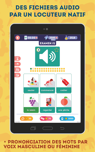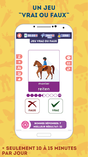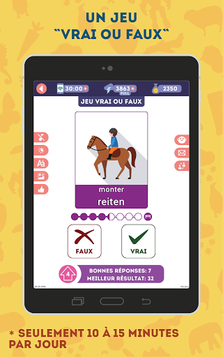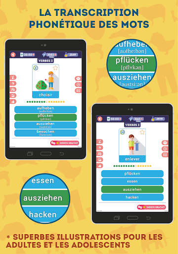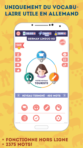 NOS AVANTAGES: * Prononciation par un locuteur natif * 2375 mots répartis en 180 leçons * Pas besoin d\être connecté en permanence sur internet * Une superbe illustration pour chaque mot *Transcription phonétique de chaque mot *Interface moins lumineuse pour apprendre la nuit *Choix entre une voix d\homme ou de femme *Dictionnaire évolutif intégré dans l\application * Jeu \vrai ou faux\ pour réviser les notions abordées * Des leçons spéciales avec des mots usuels, difficiles, anciens ou aléatoires * Des paramètres de son réglables (musique, locuteur, effets sonores) * Seulement 10 à 15 minutes par jour pour apprendre le vocabulaire * Convient aux adultes et aux adolescents de plus de 13 ans Seulement 10 à 15 minutes par jour Avec 10 à 15 minutes par jour, vous vous souviendrez facilement du vocabulaire allemand utile. Lorsqu\on mémorise du vocabulaire, la fréquence des leçons est plus importante que leur durée. Apprendre pendant 10 minutes chaque jour de la semaine sera plus productif qu\une leçon d\une heure. Des leçons d\une minute Nous avons tenu compte de nos vies modernes bien remplies et avons conçu chaque leçon de manière à ce qu\elle ne vous prenne pas plus d\une minute. Ainsi, vous n\aurez plus besoin de courir après le temps pour apprendre l\allemand! Quand vous en avez l\occasion, lancez tout simplement l\application et révisez une leçon à la fois. Seulement du vocabulaire utile en allemand L\application est une façon facile et gratuite d\apprendre l\allemand! Contrairement à d\autres, nous vous proposons seulement le vocabulaire le plus utile, réparti en 180 thèmes de leçon. Illustrations spécialement créées Nous utilisons des illustrations spécialement conçues par des infographistes qui permettent une identification visuelle rapide du sens du mot ou de l\action, sans vous encombrer de détails superflus. Prononciation du vocabulaire par des locuteurs natifs Notre application vous aidera à maîtriser la prononciation du vocabulaire allemand! Chaque mot a été enregistré par un locuteur natif professionnel. De plus, vous pouvez choisir dans les paramètres une voix masculine ou féminine. Progression dynamique des leçons L\application augmente la difficulté des leçons au fur et à mesure de votre progression. Pour ce faire, elle garde en mémoire des statistiques sur chaque mot ! Ainsi, en mode orthographe, vous devez insérer les lettres manquantes au début, puis vous devez créer le mot à l\aide de lettres supplémentaires, et quand vous vous sentez prêts, vous tapez le mot sur le clavier virtuel. Modes d\apprentissage rapide L\application comporte quatre types de leçon supplémentaires : pour les mots usuels, les difficiles, les anciens et les aléatoires. Chaque mot peut être inclus dans l\une des listes, vous permettant ainsi de créer des leçons adaptées à vous. Les mots sont automatiquement catégorisés \difficiles\ et \anciens\. Le mode aléatoire créera une leçon unique. Pas besoin de savoir comment lire Si vous ne pouvez pas lire encore, aucun problème! Chaque mot a sa transcription dans votre langue (comme dans un dictionnaire) ! Fonctionnalités supplémentaires Grâce à vos avis, nous améliorons régulièrement l\application avec des mises à jour! Pour vous aider à prendre soin de votre vue, vous pouvez activer le mode nuit d\un simple toucher. Si vous êtes temporairement sans connexion internet, aucun problème! L\application fonctionne aussi hors ligne! Révision des leçons précédentes Beaucoup de bonnes applications ne se concentrent pas suffisamment sur la révision des leçons précédentes. C\est pourquoi nous avons conçu un jeu \vrai ou faux\ : il est très simple, mais particulièrement addictif, et surtout il vous aide à réviser les leçons précédentes et à ne pas les oublier. ASSISTANCE ET CONTACT Si vous avez quelque remarque, question ou suggestion, n\hésitez surtout pas à envoyer un e-mail à admin@lin-duo.com