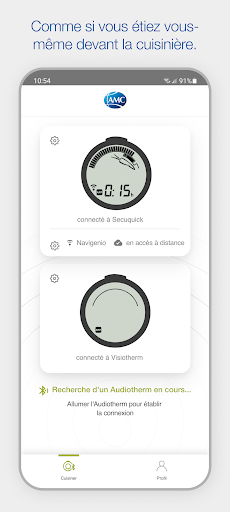 Faites passer votre Audiotherm au niveau supérieur et connectez-le à l\application AMC Cook & Go. Réglez l\Audiotherm en quelques secondes, ouvrez à nouveau les programmes de cuisson enregistrés en un clic et restez informé du processus de cuisson sans rester dans la cuisine. En vous permettant de visualiser et d\utiliser l\écran de l\Audiotherm qui est reflété sur votre appareil, l\application AMC vous permet de contrôler l\Audiotherm de manière simple et intuitive. Vous pouvez également sélectionner des réglages Audiotherm spécifiques ou enregistrer des programmes de cuisson avec vos temps de cuisson individuels. Et n\oubliez pas un autre avantage de l\utilisation de l\application AMC : Parce qu\elle vous informe de toutes les étapes du processus de cuisson, elle vous rassure sur le fait que vous avez le contrôle de ce qui est en train de cuire lorsque vous n\êtes pas à portée de voix de l\Audiotherm.