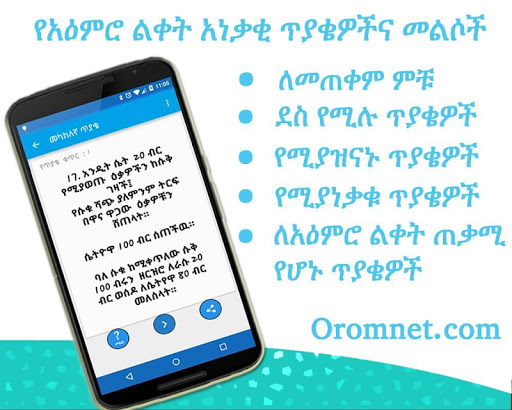 Amharic IQ Questions የIQ ጥያቄዎችና መልሶች በአማርኛ የአዕምሮ ልቀት አነቃቂ ጥያቄዎችና መልሶች የአዕምሮ ምዘና ጥያቄዎችና መልሶች ይህ የአማርኛ IQ አፕሊክሽን ከራስዎ ከጓደኛዎ እና ከቤተሰቦዎ ጋር በመሆን አሳታፊ የሆኑ ጥያቄዎችን በመጠቀም እንዲዝናኑበት ታስቦ የተዘጋጀ ነዉ፡፡ አፕልኬሽኑ አመክንዮ ሎጂካዊ አስተሳሰብን እንዲጠቀሙ የሚያድረጉ ጭንቅላትን ማዝናናትና ማነቃቃት የሚችሉ ጥያቄዎች አካቷል፡፡ አፕሊኬሽኑ የያዛቸዉ የIQ ጥያቄዎች፡- ቀላል የIQ ጥያቄዎች፣ መካከለኛ የIQ ጥያቄዎች፣ ከባድ የIQ ጥያቄዎችን እና የሒሳብ ጥያቄዎችን እንዲሁም ፊደላዊ የIQ ጥያቄዎችን ይዟል፡፡ እነዚህን ጥያቄዎች በማንኛዉም እድሜ የሚገኝ ሰዉ ሊጠቀምበት ይችላል፡፡ በዚህ የአማርኛ IQ ጥያቄዎች አንድትዝናኑበት እና በተለያዩ የመልዕክት ማስተላለፊያዎች ተጠቅማችሁ ከወዳጅ ጓደኞቻችሁ ጋር እንድትላላኩ ታስቦ በምቹ አቀራረብ የተዘጋጀ የሞባይል አፕሊኬሽን ነዉ፡፡ በስራ የደከመ አእምሮን ለማዝናናት ሞባይሎ ላይ በመጫን እንዲጠቀሙበት እንጋብዞታለን፡፡ We are living in information age, we can memorize but that is not enough because there are too much information around us. It is just enough if we know where and how to find them. But processing information, finding exactly what is relevant to us needs some kind of IQ or brain Intelligence or brilliance or smartness. For that we need to cultivate our brain to elevate our IQ. One of those tools that magnify and strengthen our IQ is IQ questions. Our body needs sport (Exercise) to be healthy and strong, our skin needs care to keep glowing, our hair needs care, .... our brain needs knowledge and entertainment to be more productive and effective, yes our brain needs challenges to be brighter, IQ Questions will sharpen our brain! Intelligence and brilliance grows with experience, with reading, with challenges, with Life experience, .... and so on. IQ Questions will make us smarter, sharper, brighter ... install and challenge yourself. We are delighted to brought you this Amharic IQ Questions Android Free Apps. The questions are carefully selected to challenge you and entertain you at the same time. Hopefully you will love it. The questions are categorized to make it level oriented. There are Easy Questions, Average or Medium Questions, Hard and challenging question and more. Please rate our app in the Google Play store. Thank you for downloading, ኦሮምኔት የሶፍትዌር እና የሞባይል አፕልኬሽን ዲቬሎፕመንት PLC ነቀምቴ ኢትዮጵያ OROMNET Software and Application Development PLC, Nekemte, Ethiopia