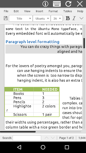 AndroDOC est une application pour éditer des documents Word que vous pourrez créer, modifier et partager. AndroDOC combine la fonctionnalité d\un gestionnaire de fichiers android avec le logiciel open source pour l\édition de documents Word, LibreOffice. Il contient deux modules principaux: * Le module DOC & DOCX, qui offre les fonctionnalités suivantes: - Créer des documents WORD sous différents formats. - Modifiez des documents WORD depuis OpenOffice, LibreOffice ou Microsoft Excel. - Recherche de textes. - Insérer des images / tableaux / fichiers. - Gestion de style: taille de police, style de police. - Rechercher et remplacer. - Open source. - Exporter vers PDF à partir de documents. - Les formats de document supportés sont les formats OpenDocuments (.odt et .ott), mais en plus de ceux-ci, AndroDOC peut ouvrir les formats utilisés par Microsoft (.doc et .docx) (voir https://wiki.openoffice.org/wiki/). Documentation / OOo3_Guides_utilisateur / Getting_Started / Formats_fichiers): · Microsoft Word 6.0 / 95/97/2000 / XP (.doc) · Microsoft Word 2007 XML (.docx) · Microsoft WinWord 5 (.doc) · Document de texte ODF LibreOffice (.odt) · Document texte OpenOffice ODF (.odt) · Format RTF (.rtf) · Texte et CSV (.csv et .txt) * Le module gestionnaire de fichiers, qui fournit les fonctionnalités suivantes: - Répertoire personnel lorsque vous chargez le gestionnaire de fichiers pour la première fois. - Toutes les opérations avec des fichiers et des dossiers: copier, déplacer, télécharger, créer un dossier / fichier, renommer, archiver, extraire, éditer, etc. - Signets sur les fichiers ou répertoires. - Afficher les propriétés du fichier ou du répertoire: nom, emplacement, taille, date. - Léger et élégant interface client prenant en charge les téléphones et les tablettes. - Grid, List et Icons vues disponibles. - Trier par nom, dernière modification, taille ou type. - Accès FTP intégré. - Support d\aperçu d\image - Recherche de fichiers - Fichiers récents - Open source AndroDOC est basé sur le gestionnaire de fichiers androïde Amaze et LibreOffice Online en cours d\exécution sur nos serveurs cloud. Son code source est ouvert et se trouve dans http://www.entertainmentmobileapps.com/source/androdoc