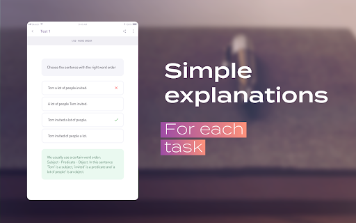 Testez vos connaissances de la grammaire anglaise. Grande conception minimaliste et interface utilisateur claire. Grammar Test d\anglais pour le niveau intermédiaire et intermédiaire supérieur. Caractéristiques: - 60 tests mixtes - 120 tests de sujet - 1200 tâches - 20 Anglais unités de grammaire dans chaque test - Des explications simples - Score total et le progrès analytics - Interface claire utilisateur - Un bon design Grammaire sujets(Grammar topics): - Word Order - Articles - Present Tenses - Past Tenses - Future Tense - Passive Voice - Modal Verbs - Phrasal Verbs - Irregular Verbs - Pronouns - Adjectives - Adverbs - Relative Clauses - Noun plus Preposition - Prepositions - Adjective plus Preposition - Nouns - Some, any, a lot of, many, much etc. - Conditionals - Reported Speech - Gerund - Infinitives - Confusing Words - Linking Words - Expressing hypothetical meaning - Word Formation