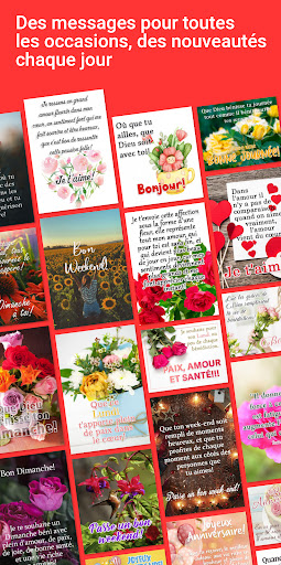 Des messages d\amour, d\affection et d\amitié, l\application idéale pour toi, qui veux chaque jour de beaux messages prêts à être envoyés, des status pour chaque occasion, à partager avec tes amis, ta famille et ceux que tu aimes. Chaque jour, des images avec de magnifiques arrières-plans, des phrases et des status mis à jour pour souhaiter une bonne journée, bon après-midi, bonne nuit, l\amour, chaque jour de la semaine, l\amitié, la religion, la foi, la motivation, la réflexion, Je t\aime, pour votre relation amoureuse, le mariage, des blagues, un anniversaire, des félicitations, des dates spéciales et jours fériés, et bien d\autres... Et ce n\est pas fini ! Nous avons aussi (des stickers) de pleins de thèmes différents à ajouter à ton Whastapp . Partage sur tes réseaux sociaux favoris! Comment: Whatsapp, Facebook et Instagram . Fonctionnalités principales : ☆DES STATUS POUR CHAQUE EVENEMENT ✓Salutations (bonjour, bon après-midi et bonne nuit ) ✓Les jours de la semaine (Lundi, Mardi, Mercredi, Jeudi, Vendredi, Samedi, Dimanche) ✓L\amour (je t\aime, en couple, mariage, romantique) ✓Des dates spéciales(Fête des Mères, Fête des Pères, Pâques, Saint Valentin, Noël, Jour de l\Amitié et bien d\autres...) ✓Religion (Foi, Dieu, Vers, Messages Bibliques) ✓Amitié ✓Motivation ✓Anniversaire (Félicitations, Meilleur voeux) ✓Réflexion et Inspiration ☆AJOUTE DE JOLIS (STICKERS) À WHATSAPP ✓Stickers de thèmes variés à ajouter à Whatsapp ✓Ajoute-les en un clic ☆AUTRES FONCTIONNALITES ✓Navigue facilement parmis les différentes catégories ✓Des messages chaque jour ✓Customise des messages d\amour et d\anniversaire ✓Partage les phrases en messages ou en status ✓Ajoute certains messages à ta liste de favoris ✓Regarde les publications les plus partagées de la semaine ✓Partage sur les principaux résaux sociaux facilement (Whatsapp, Facebook et Instagram...) ✓Recherche la catégorie souhaitée N\attends plus et installe l\application tout de suite! Et n\oublie pas de nous dire ce que tu as pensé de l\application! C\est très important pour nous