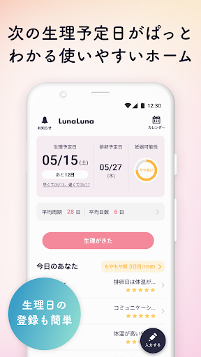 ルナルナは女性の生理に寄り添って20年以上!!2,000万DL突破しました!! 次の生理日や排卵日、妊娠しやすい時期/妊娠しづらい時期、ダイエットにオススメの時期や日々の体調など、女性が気になる情報がつまった基本無料の生理日管理アプリです! ◇◆概要◆◇ 生理が来たら、生理日をパッと簡単入力。 それだけで、次の生理予定日(生理日予測)、排卵予定日(排卵日予測)、ダイエットに最適な時期やお肌の調子など、あなたのカラダやココロの状態をお知らせ! 生理日を記録すればするほど、あなたの周期にあわせて予測精度がアップ!手軽に生理日予測ができてとっても便利な、女性のための体調管理アプリです。 ◇◆『ルナルナ』だけの独自アルゴリズム◆◇ ルナルナが15年以上貯めてきたデータをもとに開発したルナルナ独自の排卵日予測アルゴリズムを提供。(*特許取得済み) あなたの生理周期に合わせた排卵予定日や妊娠可能性をお知らせします! ◇◆『ルナルナ』が医療機関でも!◆◇ ルナルナで記録したデータを全国の婦人科・産婦人科の診察で利用できます。 『ルナルナ メディコ』導入済みの医療機関は全国に拡大中! ◇◆ルナルナアプリの特徴◆◇ ・次の生理日をホーム画面でカウントダウンとともにわかりやすく表示。具体的な生理予定日、排卵予定日や、妊娠可能性の高い/低いもアプリを開けば一目で分かります! ・生理日が近くなると、ホームに記録ボタンを表示。ポンポンっとタップするだけで簡単に毎回の生理を記録できます。 ・生理周期とカラダやココロの調子は、実は密接に関係しているもの。あなたの生理周期に合わせて、365日毎日更新される「カラダ」「ココロ」「ダイエット」「お肌」「キレイ」の5つの指数(アドバイス)をお届け! ・先の予定を立てたい時は、カレンダーで生理予定日/排卵予定日をチェック!3ヵ月先まで確認できるから 旅行などの計画にも使えます。 ◇◆基本機能◆◇ 1. 生理日予測/排卵日予測 記録されたこれまでの生理の生理開始日を元に、次回の生理日、排卵日を予測してお知らせします。 2. 妊娠可能性の予測 記録されたこれまでの生理から生理周期を計算し、今のあなたの妊娠可能性(妊娠しやすい日/妊娠しにくい日)を予測してお知らせします。 3. 毎日更新の指数(体調アドバイス) 生理前のイライラや体のむくみ、生理中の肌荒れなど、生理による女性ホルモンの変化と体調は密接に関係しています。ルナルナの指数(体調アドバイス)では、あなたのカラダやココロの調子を毎日お知らせ。 365日内容が変わるので、毎朝内容を確認し、どのような1日にするのか予定を考えるのにも役立ちます。 4. カレンダー 次の生理予定日、排卵予定日と、妊娠可能性の高い期間をカレンダーで確認できます。日付をタップしてその日の体調を記録するのにも便利。 「病院」「デート」なども予定も記録できます。 5. 体調管理 毎日の体調を簡単に記録できます。 生理中の体調や気分、生理痛や経血量、不正出血などワンタップで簡単に記録ができるから自分の不調や変化に気付いたり、事前に備えたりすることができます。 通院するときにも記録があれば役立ちます。 ◇◆ライフステージに応じたサービスを提供◆◇ 女性のライフスタイルは、年齢や環境に応じてひとそれぞれ。 変わるニーズにあわせて、ルナルナでは様々なステージやモードを提供しています。 ・ジュニアモード 小学生・中学生むけの初潮前から使えるモードです。 初潮前は、初潮がくる時期の目安がわかります。初潮後も不安定な生理に寄り添い、生理予定日や生理周期などが管理できます。 その他にも、年齢に合わせてはじめての生理についてのコラムを配信中。シンプルでかわいいデザインのモードです。 ・ピル(OC /LEP)モード ピルを服用している方むけのモードです。 服薬記録や飲み忘れ防止アラームで日々の服薬をお助けします。 ・妊娠希望ステージ 妊娠を希望している方むけのステージです。 「仲良し日」は、ルナルナが15年以上貯めてきたデータをもとに開発したルナルナ独自の排卵日予測アルゴリズム。(*特許取得済み)あなたの最も妊娠しやすい日をピンポイントでお知らせします。 ※「仲良し日」はプレミアムコースの機能です。 ・妊娠中ステージ 妊娠中は姉妹アプリの「ルナルナ ベビー」で! おなかの中の赤ちゃんの様子を毎日お届けします。 ・エイジングモード 年齢による生理周期の乱れを感じたり、プレ更年期・更年期が気になる方むけのモードです。 ◇◆プレミアムコースのご紹介◆◇ 無料アプリよりさらに充実したサポート機能が盛りだくさん! 一部の有料機能をご紹介いたします。※加入は任意です ・妊娠可能性の高い”仲良し日” ・便秘・コミュニケーション指数 ・生理日予測、排卵日予測の延長 ・教えて先生 ・セルフチェック ・パートナー共有 ・体調レポート、データ分析 ・広告バナー削除 ※一部サービス内の広告バナーは削除されません。 <ルナルナ利用規約・プ