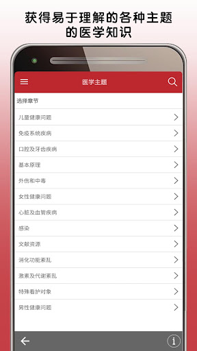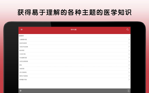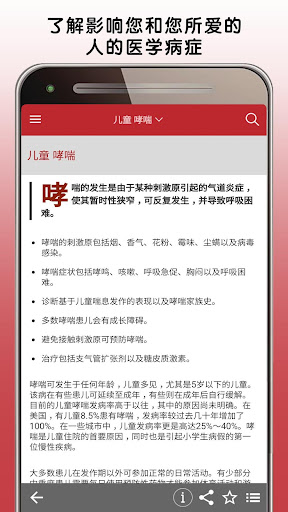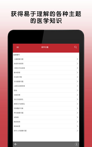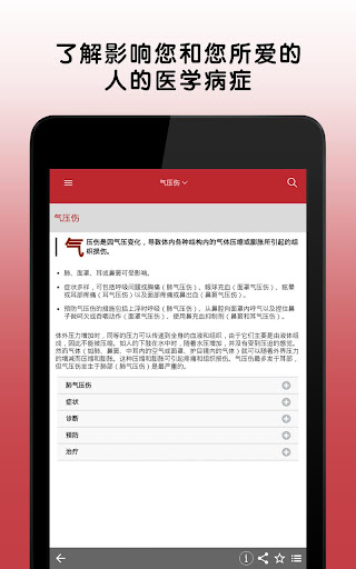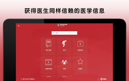 关于下载的特别说明 *** 下载此应用程序分为两个步骤:第一步是下载应用程序模板,第二步是完整下载应用程序内容。在使用 Wifi 上网的 64 位设备中,这可能需要 5 到 10 分钟时间。32 位设备可能需要更长的时间。请在两个步骤均完成后再离开此应用程序。*** 此版本的默沙东诊疗手册医疗信息应用程序专为患者、护理者和家庭开发,非常贴合您的需求。默沙东诊疗手册(大众版)应用程序采用日常语言编写,现在还提供许多新功能和增强功能。默沙东诊疗手册(大众版)为数以千计的医学病症提供了清晰、实用的解释,包括症状以及医生的诊断和治疗方法。 值得信赖的便携式默沙东诊疗手册(大众版)医疗信息应用程序提供: • 由超过 350 名医学专家定期撰写并定期更新健康和医疗信息 • 可按症状、诊断或治疗等搜索主题,全部内容均以通俗易懂的语言编写 • 数千种疾病和病症的照片和插图 • 视觉上展示疾病和治疗的动画 • 用于测试健康主题相关知识的交互式测验* • 用于检查您的健康和体质水平的自我评估* *需要连接互联网。 关于默沙东诊疗手册 我们的使命简单明了: 我们坚信,取得健康信息是人人都应享受的权利,并且人人都有权获得准确、易得和可用的医学信息。我们有责任保护、保存并分享当前最佳的医学信息,促成明智的决定,增进病人和专业医护人员之间的关系,改善全世界医疗保健成果。 因此,我们致力于用电子版形式免费向全球专业医护人员和病人提供默沙东诊疗手册。无需注册或订阅,也没有广告。 NOND-1179303-0001 04/16 有关更多信息,请阅读最终用户许可协议,网址: https://www.msd.com/policy/terms-of-use/home.html 有关我们的隐私惯例的更多信息,请参阅我们的隐私承诺,网址:https://www.msdprivacy.com 不良事件报告:如要报告特定默沙东产品的不良事件,请致电默沙东全国服务中心,电话 1-800-672-6372。美国以外的国家/地区可能设有特定的不良事件报告受理程序。请联系您当地的默沙东办事处或当地卫生当局获取更多信息。 如有问题或如需应用程序方面的帮助,请联系 msdmanualsinfo@msd.com