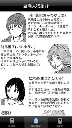 人を好きになるってなんだろう? 生きる意味ってなんだろう? 不思議な力を持つ男子高校生と 不運を呼ぶ女子高生。 2人の心が生み出すドラマに 心動かされ、考えさせられる漫画です。 多くの人に読んでもらえるよう 全話無料で提供していきます。 作者(∞JACOBIAN)は素人のため 絵はイマイチかもしれませんが 読み応え十分のストーリーをお楽しみください。 ・第1巻の掲載ストーリー 第1話 「ラッキーボーイ優馬」 第2話 「アンラッキーガール」 第3話 「自殺か事故か」 第4話 「俺は見たからな」 第5話 「初デート」 第6話 「能馬の本音」 第7話 「留年の危機」 第8話 「テニス大会」 漫画の内容や、アプリの操作感についてなど 評価・レビューはお気軽にどうぞ! ------------------------------ 漫画 原作:∞JACOBIAN アプリ開発:KAZUYA KAMIOKA