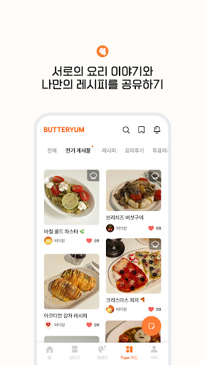 쉽고 재미있는 요리생활, 버터얌 요리가 하고 싶어지는 순간부터 완성된 요리를 공유하기까지, 모든 요리생활을 버터얌 하나로! [주요 기능] 1. 요리 레시피 탐색 및 추천 - 취향분석 설정을 통해 나에게 꼭 맞는 레시피를 추천해드려요! 2. 레시피 영상 - 요리 순서에 맞는 영상 구간과 요리 방법을 볼 수 있어요! - 다시 보고싶은 구간만 반복하여 재생하고 타이머도 설정할 수 있어요! 3. 커뮤니티 - 버터얌 유저들과 요리이야기를 나눠요! - 나만의 요리일기를 버터얌에 기록해요! 4. 냉장고 - 나의 냉장고 속 재료들을 등록하고, 소비기한 알림도 받을 수 있어요! - 내 냉장고 속 재료로 할 수 있는 레시피도 추천해드려요! 5. 레시피북 - 좋아하는 요리 레시피 영상을 나만의 레시피북으로 저장할 수 있어요! - 레시피 영상, 게시물 뿐만 아니라 외부 레시피도 링크가 있다면 레시피북에 저장할 수 있어요! [접근권한 안내] - 버터얌은 원활한 서비스 제공을 위해 아래의 접근 권한을 필요로 합니다. - 선택 접근 권한: 저장 공간 / 카메라 선택 접근 권한은 서비스 이용 중 사진을 업로드하기 위해 기기 접근을 선택적으로 허용할 수 있으며, 허용하지 않으셔도 해당 기능 외 서비스는 이용이 가능합니다. 서비스에 대한 불편사항/문의사항/건의사항은 언제든지 App 내 문의하기로 문의 부탁드립니다.