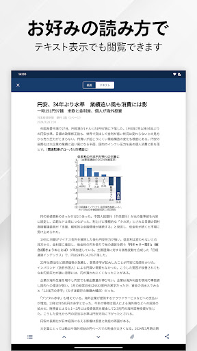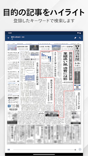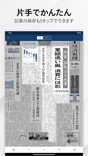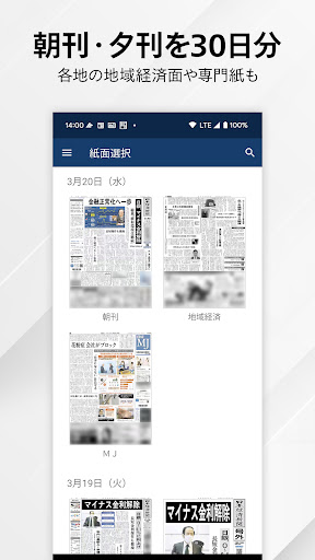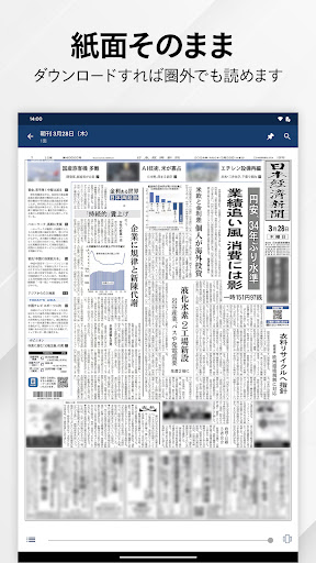 ・日本経済新聞の朝刊・夕刊、全国の地域経済面、各専門紙を紙面イメージそのままで直近30日分読むことができます。 ・お気に入りの記事を保存できます。保存した記事はパソコンやスマホ、タブレットでもご覧いただけます。 ・キーワードを登録すると、キーワードが含まれている記事がハイライト表示されます。 ・紙面をダウンロードしておけば、地下など電波のつながらない場所でも、記事の閲覧や検索、保存などの基本機能をご利用いただけます。 ・お好みや端末容量に合わせて、画質を三段階から選択できます。 ※日経電子版(有料)、日本経済新聞(日経ID決済)、各専門紙をご購読の上ご利用ください。