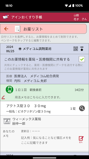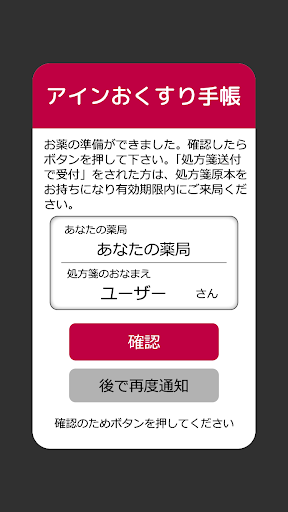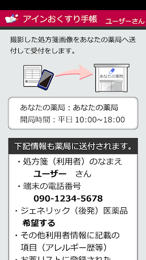 アインお薬手帳は、電子お薬手帳を基本とし、お薬受け取りまでの時間を有効に使える便利な機能の「スマート薬局」機能を追加した電子お薬手帳アプリです。 ご利用薬局※1としてアイングループの薬局をご登録いただくことで、「スマート薬局」機能である、「処方箋送信機能」「お薬できあがり呼出」「お薬リスト提示」の3機能を簡単手順でご利用いただけます。 ・電子お薬手帳としてのご利用 ご利用薬局※1としてご登録いただいたアイングループの薬局から受け取ったお薬の情報は、QRコードを介さずに直接薬局からアプリへWEB送信されます。 ご利用薬局※1に登録した薬局以外の薬局から受け取ったお薬の情報もQRコードを読み込むことでアプリへの登録が可能です。※2 OTC医薬品等処方薬以外のお薬情報は、写真として登録が可能です。 ・スマート薬局のご利用 スマート薬局のご利用には、アインお薬手帳サービスを導入している薬局リストからご利用薬局※1の指定が必要となります。 北海道から沖縄まで全国のアイングループの薬局900ヵ所以上で利用可能です。 ・Chk4.me(チェックフォー・ミー)のご利用 薬局だけでなく、医師や介護士等へ登録されているお薬リストの情報を閲覧していただくことが可能です。 スマートフォンを渡す必要もなく、インターネットに接続できるパソコンで確認が可能です。 ■8つの機能とメリット ◇「処方箋送付で受付」 :いつものご利用薬局※に行く前に、処方箋をスマートフォンのカメラで撮影し、送信しておきます。お薬ができたらアプリにお知らせしてくれますので、薬局での待ち時間を短縮でき、お好きな時間にお薬を受け取れます。 ◇「お薬できあがり呼出」:ご利用薬局※に処方箋を持参して提出した時でも、呼出依頼をしておくだけで、お薬ができたらアプリにお知らせしてくれますので、薬局内でお薬のできあがりをお待ちいただくことなく、待ち時間をあなたの時間として有効に使えます。 ◇「お薬リストを提示」:ご利用薬局※1で薬剤師の求めに応じて、お薬手帳アプリ内に登録したお薬情報を薬剤師とワンボタンで共有できます。閲覧のためにお薬手帳アプリがインストールされたスマートフォンを渡す必要もなく、安心です。 ◇「お薬リスト」 :これまでのお薬の履歴や服用中のお薬を管理できます。お薬の登録方法として二次元バーコード読み込みと写真保存、手動での入力に対応しています。薬剤名をワンボタンで検索し、詳細な情報を読むこともできる「お薬検索」もプラスされています。 ◇「服用アラーム」 :お薬の飲み忘れ防止のため、お薬の時間になるとアラームでお知らせします。朝・昼・晩のアラーム時刻設定はもちろん、週一回といった設定も可能です。 ◇「マルチユーザー機能」 :家族のお薬の情報を一人ずつ服用管理できます。家族皆に役立つお薬手帳アプリです。 ◇「Chk4.me(チェックフォー・ミー)」:医療機関を受診した際、医療機関のパソコン上でアインお薬手帳の情報を確認していただく機能です。 ワンタイムコードを利用したシステムのため、個人情報のへの配慮も対応済です。 ◇「フォローアップ・メッセージ」 :服薬状況等を薬局から確認させていただくメッセージ機能です。簡単な操作で回答ができ、服薬中に気になることがあれば返信にて気軽に相談ができます。 ※1アプリ内の薬局リストに掲載されているアインお薬手帳サービスを実施している薬局をさします。 ※2 JAHIS(保健医療福祉情報システム工業会)に準拠したQRコードの読み取りが可能です。 本アプリは、電子お薬手帳の相互閲覧サービス「e薬Link」に対応しています。 「e薬Link(イークスリンク)」は、(公社)日本薬剤師会が提供する、異なる電子お薬手帳サービス間の情報を相互閲覧できるようにする仕組みです。 ●ご注意事項 ・アプリをご利用される前にご利用規約をお読みいただき、ご同意された場合のみご利用ください。 ・ご利用の端末の設定時刻がずれていたり、地域設定が日本以外の場合に正常に動作しないことがあります。 ・当スマートフォンアプリのご利用は無料です。ダウンロード通信料は別途かかります。