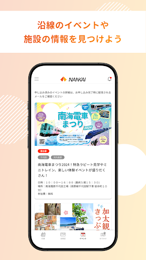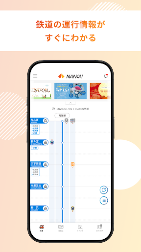 電車の運行状況・リアルタイム走行位置・駅情報・遅延情報などが確認できるほか、minapita会員証の表示や沿線のお出かけ情報のチェックもできる、南海電鉄公式アプリです。 通勤・通学やおでかけなど、南海電鉄をご利用のお客さまはぜひご利用ください。 ■リアルタイムに走行位置が分かります! 路線図上に電車の位置がリアルタイムで表示されるので、あとどのくらいで電車が来るのかひと目で分かります。(※一部区間を除く) ■プッシュ通知で遅延情報をお知らせ! ご利用の路線で20分以上の遅延が発生した場合、遅延情報をプッシュ通知でお知らせします。 ※「遅延情報の通知設定」でご利用の路線の通知をONにしてご利用ください。 ■My駅登録でもっと便利に! よく利用する駅をMy駅として登録することで、列車走行位置の画面でその駅を中央に表示したり、駅周辺のお得な情報を受け取ったりできます。 ■駅の情報をチェックできます! 乗り換え路線、停車する電車の種別、次に発車する電車の時刻などをご確認いただけます。(※一部駅を除く) ■南海電鉄の情報がひとつに! 乗り換え案内、遅延証明書、特急券予約、バス検索など、南海電鉄の各情報へアクセスできます。 ■minapita会員証を南海アプリで表示! minapita会員証が、南海アプリでご利用いただけます。対象店舗でお買い物の際に会員証を提示することで、minapitaポイントをためたり使ったりできます。 ■駅周辺の商業施設の情報をチェック! 駅隣接の商業施設の情報をご覧いただけます。お出かけ先でのお買い物やお食事の計画にご活用ください。 ■沿線のイベント情報を探せます! 南海沿線で開催されるイベント情報を、南海アプリ上で簡単にチェックできます。気になるイベントには、そのままアプリから参加申し込みページへアクセスできます。 ■難波駅構内の個室トイレの空き状況を確認できます。 ■「阪堺電車」の運行情報や、バリアフリー対応車両などの電車種別がひと目で分かります。 ■他社線アプリ連携 列車走行位置画面で各鉄道会社のアイコンをタップすることで、連携している他社線のアプリ(近鉄アプリ、阪神アプリ、WESTERアプリ)に遷移できます。 【ご注意】 ※リアルタイム走行位置は、一部区間ではご利用いただけません。あらかじめご了承ください。 ※アプリは無料でご利用いただけますが、情報取得時の通信料はお客さまのご負担となります。 ※通信環境によりアプリが正常に作動しない場合があります。通信環境をお確かめのうえご利用ください。