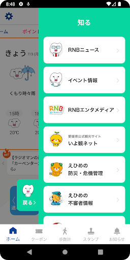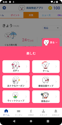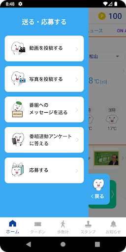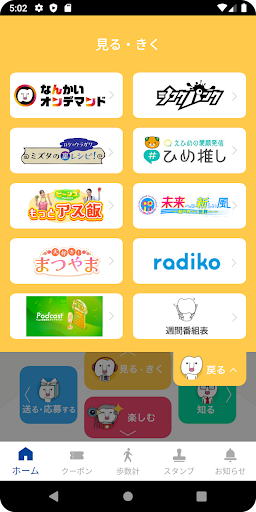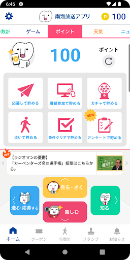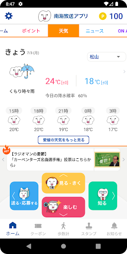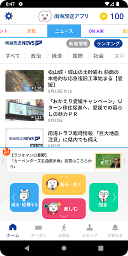 『\愛媛の情報をいち早く!南海放送をもっと身近に!/ 南海放送のオリジナルアプリ! 愛媛県のテレビ・ラジオ兼営局である南海放送が、愛媛のみなさんにもっと寄り添い、さらに信頼される南海放送でありたいという願いを込めてお届けするオリジナルコミュニケーションアプリです。 南海放送の番組に連動したアンケートやクーポンを発行するほか、視聴者・リスナーのみなさんと南海放送との繋がりを「送る・応募する」「知る」「見る・きく」「楽しむ」といった4つのカテゴリーに分け、愛媛のニュースや天気、番組情報などをお届けする一方、動画やメッセージの投稿、プレゼント応募を簡単に行っていただくことができます。 また南海放送アプリ限定で、夕方ニュース番組「NEWS CH.4」をリアルタイム配信。外出先でも、県外でも愛媛のニュースをご覧いただけます。 【主な機能】 ◆クーポン 時季に合わせて店舗で使えるお得なクーポンを毎月お届けします。 番組やイベントの中で特別クーポンを発行することも。アプリ内の二次元バーコードカメラを立ち上げてゲットしてください。 ◆歩数計 スマートフォン内蔵のヘルスメーターなどと連動して、日々の歩数をグラフで表示します。 全参加者の中のあなたの順位を表示するほか、アナウンサーとの対決もお楽しみいただけます。楽しみながら健康増進にご利用ください。 ◆マップ 「南海放送で紹介していたお店に行きたい」の声にお応えします。スマホのGPS機能を利用して、あなたがいる地点周辺の番組で紹介店舗を表示します。 ◆ポイント アプリの立ち上げや応募、歩数などに応じて、オリジナルのポイントを付与します。 貯まったポイントに応じて、商品に交換したり、応募したりすることができます。 ◆スタンプラリー 放送番組やイベントでスタンプをゲットできます!集めてプレゼント応募できる企画もあるのでご参加ください。 [送る・応募する] ・動画・写真投稿 スマホで撮影したスクープ映像やオモシロ映像を簡単に送っていただけます! (投稿映像は、夕方ニュース「NEWS CH.4」や番組などで利用させていただく場合があります) ・メッセージ 番組へのメッセージ、ご意見、ご感想を簡単に送信!お気軽に番組にご参加ください。 ・プレゼント応募 テレビやラジオの番組プレゼントやチケットプレゼントをまとめて掲載。 アプリ限定のものも不定期でご用意!アプリに登録した情報でカンタンに応募できます! [知る] ・天気、ニュース 愛媛のニュースや地域の天気を掲載。天気情報はお住まいの細かな地域に設定できます。 朝には天気予報、夕方には県内のニュースをプッシュ通知でお知らせします。 さらにニュース速報、警報・特別警報や竜巻注意報、地震発生時の震度情報などプッシュ通知で速やかにお知らせします。 ・公式SNSや関連アプリ 南海放送のSNSやアプリをまとめて掲載! ・イベント情報 南海放送のイベント情報をいち早く掲載! [見る・きく] ・南海放送の公式YouTubeチャンネルやなんかいオンデマンド、radikoにも簡単アクセス! ・南海放送のテレビ・ラジオの番組情報や番組表を掲載 [楽しむ] ・星座占い 毎週土曜更新。ラッキーカラーやラッキーアイテムで楽しく過ごしましょう。 ・ゲーム 楽しいゲームがもりだくさん!