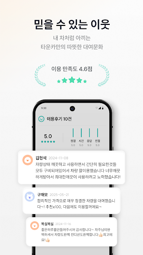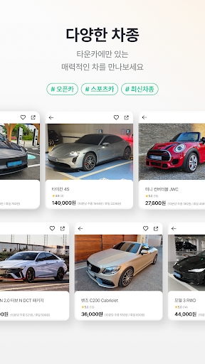 타운카는 이웃 간에 차량을 빌리고 빌려주는 P2P 차량 공유 플랫폼입니다. - 다양한 이웃의 깨끗한 차량을 저렴하게 빌려보세요. - 놀고 있는 차가 있다면 수익으로 바꿔보세요. [차가 필요하다면 – 이웃 차량 대여] 좋은 차, 합리적인 가격에 이용하고 싶다면? 타운카에서 내 주변 이웃의 차량을 간편하게 예약하세요. - 이웃의 주차장, 우리집에서 바로 픽업/반납 가능 - 필요한만큼만 10분 단위로 최저가 예약 - 개인 차주 1:1 관리로 깨끗하고 냄새 없는 차량 컨디션 - 삼성화재 전용 보험 적용으로 안심 이용 가능 지금 타운카 앱에서 내 주변 차량을 확인해보세요. [놀고 있는 차가 있다면 – 차주 등록] 운행하지 않는 시간 동안, 내 차를 이웃에게 공유하고 수익을 만들어보세요. 타운카에서 차량 등록부터 정산, 보험, 사고 대응까지 모두 지원합니다. - 월 평균 70만 원 수익 발생 가능 - 삼성화재 타운카 전용보험 적용 (차주 보호) - 내가 원하는 시간만 대여 일정 등록 가능 - 차량 구매 및 운영 관련 비용 세제혜택 지금 차주 등록하고, 내 차의 유휴시간을 수익으로 바꿔보세요. [타운카는 믿을 수 있는 이유] 타운카는 과학기술정보통신부와 국토교통부 사업 허가를 받은 국내 최초의 이웃 간 차량 공유 플랫폼입니다. - 아파트·오피스텔 등 실제 입주민 간 공유에 특화 - 운전자 심사 + 실명 인증 기반 매칭 시스템 - 차량 관리 주기적 검수 및 이력 기록 - 24시간 고객센터 + 사고 대응 체계 운영 내가 사는 동네, 실제 이웃과의 연결을 통해 더 깨끗하고 더 안전한 공유 문화를 만들어갑니다. [타운카는 이런 분들께 추천해요] - 차는 필요한데 구매까지는 부담스러운 분 - 깨끗하고 퀄리티 높은 차를 빌리고 싶은 분 - 내 차가 놀고만 있어 고정비가 아까운 분 - 가족끼리 차량을 두 대 이상 보유 중인 분 - 차량을 유휴 시간에 수익형 자산으로 활용하고 싶은 분 - 차량 구매 및 운영 비용을 절약하고 싶은 분 [지금 타운카를 시작해보세요] 차가 없어도 불편하지 않고, 있다면 낭비되지 않도록. 타운카는 소유보다 가치 있는 공유를 지향합니다. 당신의 일상과 자동차가 더 큰 가치를 가질 수 있도록, 이제 타운카에서 공유를 시작해보세요. 고객센터 & 공식 채널 - 고객센터: 1833-4155 - 카카오톡 채널: ‘타운카’ - 공식 웹사이트: https://www.towncar.co.kr/ - 블로그: https://www.towncar.co.kr/blog - 유튜브: https://www.youtube.com/@towncar_official