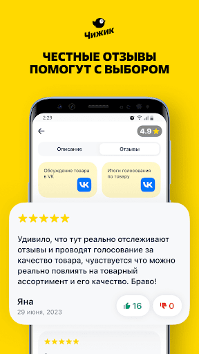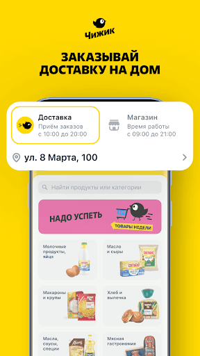 Чижик — доставка продуктов и товаров для дома по низким ценам, скидка по купону на товар дня в магазинах Ищете, где купить качественные продукты, а еще и с доставкой по доступным ценам? Скачайте приложение Чижик — это удобный способ ознакомиться с ассортиментом розничного магазина и сделать заказ продуктов с доставкой на дом! Мы доставляем свежие продукты питания и товары для дома от 149 рублей. Привезем покупки на дом всего за 30-60 минут — проверьте доступность доставки по вашему адресу в разделе «Доставка» в приложении. А если хотите прогуляться до розничного магазина, то приложение поможет ознакомиться с ассортиментом, наличием и ценами удобного вам магазина. В приложении Чижик вы найдёте: • Купоны на скидку на товары дня, а также еженедельный каталог акционных товаров \Надо успеть\ • Удобный каталог продуктов с актуальными ценами, составами и данными о наличии товара в магазинах • Где находится ближайший магазин Чижик • Сканер товаров — наведите камеру на штрих-код товара в магазине и получите полную информацию о нем • Поддержка в чате — оставьте отзыв, расскажите о проблеме или поблагодарите нас Почему выбирают Чижик для покупок и доставки еды: • Вы не переплачиваете, ведь у нас низкие цены без скрытых наценок — вы не платите за рекламу, раздутый штат или ненужный ассортимент и многое другое • Качество под контролем: строгий отбор, лабораторные тесты, а также ваши отзывы влияют на ассортимент магазина • Возврат без чека: не устроил товар? Просто верните его в магазин и получите деньги! • Покупаете по-умному: выгодно, качественно, быстро, легко. Чижик подошёл к организации по-умному и честно! В Чижике — всё, что нужно для дома: • Молочные продукты, мясо и рыба, овощи и фрукты • Хлеб, крупы, макароны, сладости, напитки и снэки • Заморозка, мороженое • Детские товары, товары для дома и животных, бытовая химия • Специи, соусы, консервы И всё это можно заказать с доставкой! Доставка доступна в Москве и области, Нижнем Новгороде, Воронеже, Екатеринбурге, Новосибирске, Ростове-на-Дону, Краснодаре, а также еще более чем в 300 населенных пунктах! Скачайте приложение Чижик — продукты и доставка еды рядом с вами! Сайт: https://chizhik.club/ ВКонтакте: https://vk.com/chizhik.club Telegram: https://t.me/chizhikmagazin Поддержка: 112@chizhik.club