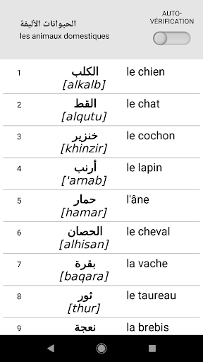 Cet outil personnel vous permet d\apprendre efficacement la prononciation et l\orthographe, grâce à un support visuel et audio. Pour l\organisation correcte du processus d\apprentissage aidera la fonction \Smart-Teacher\. Grâce à ce jeu, vous ou votre enfant pouvez développer de façon intéressante votre vocabulaire de mots étrangers à partir de zéro, fondement d’un bon niveau à l’oral et à l’écrit. L’auto-apprentissage chaque jour peut améliorer vos connaissances dans la pratique - lire, parler, écouter, écrire. Il comprend la traduction des mots plus de 40 langues. Pour une meilleure acquisition des contenus, l’enseignement est organisé selon plusieurs étapes du jeu: - Entrainement et mémorisation de l\alphabet, des noms, des adjectifs, des verbes et des chiffres à l\aide de vignettes avec une transcription phonétique et qu’une haute qualité d’enregistrement locuteur natif. - Contrôle et vérification des mots appris, via des jeux amusants, faciles et compréhensibles: • Choix du bon mot par rapport à l’image. • Choix dynamique d’image en mouvement par rapport à une liste de mots. • Écriture de mots et vérification orthographique. L\application est incluse dans le Top des meilleurs tuteurs et vous permet de parler une langue étrangère plus rapidement. La fonction Smart Teacher est très pratique, elle vous dira quelle leçon est la prochaine, elle vous aidera à mémoriser simplement et rapidement de nouveaux mots. Liste des sujets: les couleurs; les parties du corps humain; les animaux domestiques; les animaux sauvages; les parties du corps des animaux; les oiseaux; les insectes; la vie marine; la nature; les phénomènes naturels; les fruits; les légumes; la nourriture; les ustensiles de cuisine; la maison; l\intérieur de la maison; la salle de bain; les appareils ménagers; les outils; le bureau; les fournitures scolaires; l\école; les nombres; les figures géométriques; les instruments de musique; le magasin; les vêtements; les chaussures et accessoires; les jouets; l\infrastructure; le transport; le voyage; le divertissement; la technologie de l\information; l\homme; la société; les professions; le sport; les sports d\été; les sports d\hiver; les prépositions; les verbes. Ce jeu passionnant et éducatif est un support mobile pour un apprentissage autodidacte du vocabulaire et de la phonétique au niveau débutant. En réalité c`est un dictionnaire illustré et le jeu de la langue arabe, aidant à maîtriser l\arabe pour les débutants et les enfants qui permet d’apprendre en jouant les mots arabes avec le son.