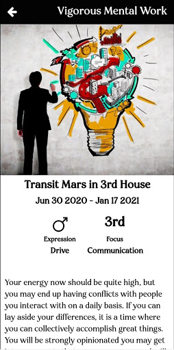 AstroMatrix Horoscopes Synastriques Cette application astrologique gratuite et facile à utiliser fournit de nombreux rapports et graphiques pour vous aider à comprendre votre thème de naissance. Cela fonctionne différemment de l\astrologie de base où vous prenez en considération votre signe du soleil. Si vous êtes fatigué des inexactitudes d\autres applications, AstroMatrix est fait pour vous! En utilisant votre date, heure et lieu de naissance, vous pouvez augmenter la précision de vos lectures astrologiques et de vos horoscopes. Trouvez facilement vos planètes et maisons en transit avec des heures et des dates précises pour vous donner des indications sur les opportunités en termes de richesse, d’état mental, de vie amoureuse, de problèmes émotionnels, ainsi que de possibilités de carrière et de défis. RAPPORTS DU TABLEAU DE NAISSANCE Rapport détaillé de votre thème natal vous donnant des informations détaillées sur chacune des positions de votre planète et leurs effets positifs et négatifs avec des sections résumées faciles à comprendre. HOROSCOPES QUOTIDIENS Se concentre sur le chemin de la lune et son incidence sur vos planètes d\origine. En outre, l\horoscope hebdomadaire suit les planètes personnelles telles que le Soleil, Mercure, Mars et Vénus et leur impact, ainsi que toutes les opportunités ou défis pouvant vous affecter HOROSCOPES MENSUELS Suit les planètes interpersonnelles telles que Jupiter, Saturne, Uranus et Pluton, leur impact, toutes les opportunités ou tous les défis qui peuvent vous affecter à plus long terme. COMPATIBILITÉ ROMANTIQUE ET AMOUREUX Les rapports Synastry peuvent être utilisés pour découvrir ce qui est formidable et également ce qui représente un défi dans votre vie amoureuse. Découvrez si vous êtes faits l\un pour l\autre, il est facile de voir ce qui est positif et négatif dans votre relation. CALENDRIER DE RÉTROGRADE Calendrier astrologique complet pour la prochaine année, les dates de la phase rétrograde de toutes les planètes incluent Mercure, Mars, Vénus, Uranus, Saturne, Neptune et Pluton. Lecture de cartes de tarot Obtenez des lectures détaillées du tarot à 3 cartes avec différentes dispositions, vous pouvez poser des questions spécifiques ou obtenir des lectures sur les événements astrologiques actuels Encore plus de fonctionnalités comprennent Zodiac avec signes astrologiques et dates de l\horoscope pour vos signes de l\horoscope. Signes d\astrologie ou signes astrologiques ainsi que le thème natal et les signes de naissance. Possibilité de sauvegarder plusieurs informations d\utilisateur. Prise en charge des astéroïdes par Chiron, Vesta, Phono, Junon, Lilith, Pallas et Cérès Horoscopes quotidiens gratuits, horoscopes hebdomadaires et horoscopes mensuels. Phases de la Lune actuelles, Prévisions de transit et prévisions planétaires actuelles, telles que Mercury Retrograde Tarot carte et lectures et symboles Jungian Sabian pour les degrés de la planète Systèmes à maisons multiples, y compris Placidus, Koch, enseigne entière, Maison égale, MC égal, Porphyre, Regiomontanus et Campanus Capacité à utiliser le système de temps sidéral ou védique