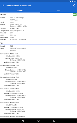 L\application METAR, TAF et météo fiable et claire pour les pilotes. L\application météo fiable et lisible pour les pilotes et les passionnés d\aviation. Le lecteur METAR décode et présente les METAR actuels de plus de 9500 aéroports dans le monde entier. Ni plus ni moins. Un simple code de couleurs permet une classification rapide en fonction des conditions VFR ou IFR - même selon l\état de couleur OTAN. De plus, les prévisions météorologiques TAF actuelles sont clairement affichées sous forme décodée. Les composants du vent de travers et du vent de face de chaque piste sont automatiquement calculées en fonction du METAR actuel. Un widget qui affiche le METAR décodé ou le METAR / TAF brut est disponible en tant que module complémentaire. L\application télécharge également les NOTAMs en tant que fonction supplémentaire, les décode et offre la possibilité de marquer les informations qui ont déjà été lus. De cette façon, vous pouvez toujours voir les NOTAMs encore inconnus. Vous pouvez rechercher de nouvelles stations météorologiques dans le monde entier en utilisant les codes OACI (ICAO) ou AITA (IATA), les noms des aéroports ou des villes. Les stations peuvent ensuite être organisés en groupes définis par l\utilisateur - par ex. pour les routes les plus fréquentées ou les aéroports de dégagement. Les stations météorologiques à proximité peuvent être trouvées dans un groupe généré automatiquement. Pour une utilisation pendant la nuit, l\application propose une couleur sombre qui peut être activé manuellement ou automatiquement (selon la version d\Android).