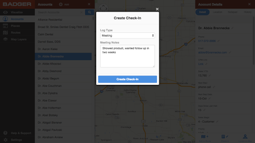 Badger Maps is a sales mapping and routing app designed specifically for field sales teams. Get 20% more meetings a week, drive 20% less miles, and save 20% on gas. Spend 50% less time on admin tasks and busy work. Badger Maps is a multi-stop route planner that helps you and your team sell more. Get set up in minutes, see all your customers on a map, and plan out your sales routes ahead of time. Badger Maps also enables a two-way, real-time integration with the most common CRMs so, you can access all of your sales data on-the-go. Get a smarter view of your territory and focus on your top priorities. Never miss an opportunity to upsell and cross-sell. Add Badger Maps to your sales strategy to visualize all your leads and customers in the field and filter them by key metrics. Create optimized routes with Badger Maps to meet the right customers at the right time. Get the Fastest Routes - Optimize routes with multiple destinations to drive fewer miles - Add up to 100+ stops to your routes - Connect routes to your favorite navigation apps, like Waze, Google Maps, or Apple Maps - Get turn-by-turn directions to all your stops - Quickly select your accounts for the day and create routes in seconds - Plan sales routes in advance so you can focus on selling Maximize your ROI with Badger Maps - Badger pays for itself just through gas savings - Drive 20% less miles, and save 20% on gas - Get 20% more meetings a week - Spend 50% less time on admin tasks and busy work Always Know Where Your Customers & Prospects Are - Easily upload your customer list as a spreadsheet or connect to your CRM - Visualize your customers and prospects on an interactive map - Colorize and filter your accounts by priority, next step, location, or other values - See your best opportunities and find more qualified leads - Create new data filters at any moment and mass update any account details Access All Your Customer Details on the Road - Create and update prospect and customer details on-the-go - Use Badger Maps on any device: PC/Mac/iOS/Android - Mobilize your CRM with Badger Maps and update it through your mobile device - Stay on top of customer relationships and make informed decisions at any time Capture Data From the Field Automatically - Use our two-way, real-time integrations with the most common CRMs - Send data back and forth to your CRM and sync your data on-the-go - Create check-ins to record your customer meetings and add to your interaction history - Receive automatic weekly reports of your key sales insights Find Leads On-the-Go - Instantly find leads based on location, industry keyword, or company name - Generate new leads in half the time - Always have a backup plan after a canceled meeting We\re a great alternative to MapPoint and Streets and Trips for sales reps on the road. If you\re ready to find even more success, try Badger Maps, the route planner for field sales! Sign up for a free trial today and take your outside sales performance to the next level. See why sales teams love Badger Maps: \After getting Badger Maps, weekly meetings per rep jumped from 12 to 20. This led to a 22% increase in annual revenue.\ - Brad Moxley, Business Development Manager, Cutter & Buck “Knowing our most valuable accounts, and the best way to get to them, saves us a ton of time driving. Badger’s route optimization cuts our drive time by 25%” - John O’Kain, Territory Manager, NCR Aloha “With Badger, you can really plan out your week based on where you can have the biggest impact.” - Matthew Brooks, Business Development Manager, Cargill Get more meetings and increase sales productivity. Try out Badger Maps for free now!