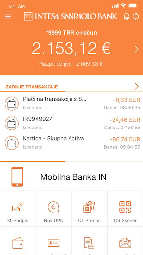Mobilno bančništvo Intese Sanpaolo Bank - Banka IN Mobile Svoboda in prosti čas postajata vedno bolj dragocena sopotnika današnjega časa. Banka IN Mobile omogoča popoln izkoristek časa, saj lahko večino bančnih storitev opravljate od doma, iz službe ali s potovanja v tujini. Omogoča vam sodoben in uporabniško prijazen način poslovanja ter vam zagotavlja popolno varnost in zasebnost podatkov. Banka IN Mobile je namenjena komitentom Intese Sanpaolo Bank, katerim je omogočeno: - Pregled sporočil in ponudb - seznam sporočil, prikaz sporočila, novo sporočilo - Podpisovanje ponudb - sklenite posel kar preko mobilne naprave - Poslovanje z računi - trenutno na računu, pregled prometa, pregled izpiskov, pooblaščeni računi - Poslovanje z e-računom - prejetje, plačilo in pregled - Pregled plačil - imenik plačil, čakajoča plačila, bodoči dogodki, prejeta in nova plačila - Pregled plačilnih kartic - seznam kartic (stanje in limit), pregled nezapadlega prometa - Pregled kreditov - seznam in stanje kreditov - Pregled naložb - seznam in stanje skladov, seznam in stanje vrednostnih papirjev. - Pregled varčevanja - seznam in stanje depozitov, varčevanj, prenos iz/na varčevalni račun - Pregled sklenjenih zavarovanih pogodb. - Pregled novic in obvestil - Spreminjanje nastavitev - obveščanje (GSM, e-pošta, potek pogodb, sprememba stanja, prejete ponudbe/pogodbe, novice in obvestila) Mobilno aplikacijo Banka IN lahko uporabite tudi kot avtentikacijski mehanizem za \mobilno prijavo\ v spletno Banko IN, ter tako izkoristite prednosti in udobnost večje Banke IN in mobilnost Mobilne Banke IN. Mobilna aplikacija Banka IN vsebuje tudi univerzalni bralnik QR kode, ki ga lahko uporabite za branje QR kod pri prijavi v Banko IN ali za druge poljubne QR kode. Poslovanje z Banko IN Mobile je enostavno, priročno in udobno, saj lahko zelo veliko bančnih storitev opravimo v času, ko smo izven pisarne ali doma, na vlaku, na odmoru, na dopustu, ne glede na kraj in čas. Mobilno bančništvo se tudi splača, saj banka tudi finančno stimulira paket telefonskega-spletnega-mobilnega bančništva. Novi komitenti pa lahko izkoristijo še prednosti brezplačnega vodenja računa v sklopu paketov dobrodošlice.