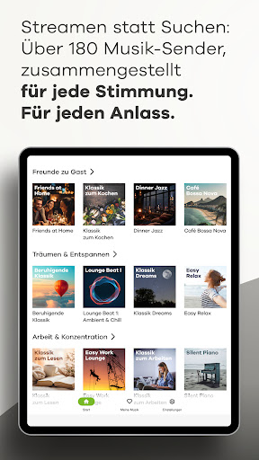 KLASSIK RADIO SELECT ist die Musik-App von KLASSIK RADIO & BEATS RADIO*. Hören Sie unsere Radiosender ohne Werbung und erhaltet Sie Zugriff auf weitere 180 Musik Sender rund um Entspannung und Feel Good. Testen Sie Premium 7 Tage gratis! WARUM KLASSIK RADIO SELECT? Im Gegensatz zu anderen Musik-Apps gibt es bei uns keine Playlisten oder Zufallswiedergaben. Alle 180 Sender werden in Kollaboration mit Musikexperten zusammengestellt. So haben wir für jede Stimmung und jeden Anlass die passende Musik. • Sie wollen vom stressigen Alltag abschalten? Hören Sie SILENT PIANO zum Entspannen. • Sie suchen den richtigen Sender zum Träumen? KLASSIK DREAMS ist genau richtig. • Sie brauchen Musik zum konzentrierten Arbeiten? Schalten Sie EASY WORK LOUNGE ein. • Sie wollen Musik für einen gemütlichen Abend zu zweit? MOVIE LOVE THEMES ist Ihr Sender. • Freunde kommen vorbei? Wie wäre DINNER JAZZ als Hintergrundmusik? • Sie haben Fernweh? Mit BELLA ITALIA, ELECTRONIC CHILL OUT und CAFÉ ANDALUZ geht es nach Italien bzw. Spanien. Es erwarten Sie feinste klassische Musik, Soundtracks, Jazz, House & Electronic, Lounge & Chill out Sounds sowie beruhigende Klangwelten. Und Ihre Musik ist nur ein Klick entfernt. SO KÖNNEN SIE DIE APP NUTZEN: Mit Klassik Radio Select haben Sie in der Free-Version Klassik Radio, Beats Radio und Movie Radio immer mit dabei und dazu Zugriff auf 50 weitere Sender aus den Bereichen Filmmusik, Lounge, Klassik und Jazz. Das Abo RADIO OHNE WERBUNG schaltet Ihnen die Werbung bei den Sendern Beats Radio, Klassik Radio und Movie Radio aus. Wenn andere Hörer in die Werbepause gehen, genießen Sie weiterhin Musik. (2,49€ pro Monat bzw. 29,99€ im Jahr) Als SELECT PREMIUM Kunde werden Ihnen alle 180 Musik-Sender freigeschaltet und Sie können alle Sender inkl. Beats Radio, Klassik Radio und Movie Radio ohne Werbung hören. Zu den Premium-Sendern gehört u.a. Klassik Radio nur die Musik, House Beats, Good Time Jazz, Waldbaden und Disney-Hits. (ab 5,49€ pro Monat bzw. 35,99€ im Halbjahr/65,99€ im Jahr) WEITERE FUNKTIONEN: Mit der Sleeptimer-Funktion können Sie jeden Abend mit Ihrer Lieblingsmusik einschlafen. Einfach den Timer stellen und nach Ablauf der Zeit beendet die App automatisch die Wiedergabe. Für das optimale Klangerlebnis können Sie Select u.a. über Bluetooth, Google Cast und Wear OS mit Ihren Lautsprechern und Kopfhörern verbinden. Klassik Radio Select ist auch über SONOS nutzbar. UNSERE THMENENWELTEN • Klassische Musik von Mozart über Beethoven bis zu den Stars der modernen Klassik • Die besten Soundtracks von Harry Potter bis James Bond - von den Komponisten Hans Zimmer, John Williams, Ennio Morricone u.v.m. • Relaxter Electronic Sound aus den Bereichen (Deep) House, Indie & Dance für 365 Jahre Sommer und Urlaub. • Musik für Meditation, Naturklänge zum Waldbaden • Die großen Jazz Stimmen wie Louis Armstrong und Ella Fitzgerald • Die schönste Weihnachtsmusik für die besondere Zeit im Jahr GUT ZU WISSEN • Innerhalb der ersten 7 Tage können Sie das Angebot gratis testen. Wenn es Ihnen nicht gefällt, reicht ein Klick auf „kündigen“, um das Abo zu beenden. Ihnen entstehen keine Kosten. • Ab dem 8. Tag geht das Abo automatisch in die Bezahlversion über. • Nach dem Kauf wird die Zahlung über Ihren Google Play Account abgebucht • Das Abonnement verlängert sich automatisch, sofern nicht mindestens 24 Stunden vor Ende der aktuellen Zahlungsperiode die automatische Verlängerung deaktiviert wurde • Das Konto wird im Rahmen der Verlängerung des Abonnements innerhalb 24 Stunden vor Ende der aktuellen Zahlungsperiode mit den Kosten für die Verlängerung belastet • Der Nutzer kann das Abonnement sowie dessen automatische Verlängerung über die Account Einstellungen selbst verwalten Privacy policy: https://www.klassikradio.de/datenschutz-klassik-radio-select/ Terms of use: https://www.klassikradio.de/agb/klassik-radio-select-nutzungsbedingungen/ *Beats Radio ist eine Audio Brand der Klassik Radio AG