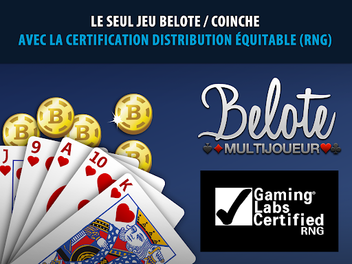 Jouez au jeu n°1 de Belote & de Coinche, le jeu de cartes le plus populaire en France et en Afrique du Nord (développé par un studio français) avec plus de 200 000 joueurs en ligne tous les jours ou entre amis comme à la maison ! Faites des parties de Belote, de Coinche ou de Coinche TA/SA (Tout Atout / Sans Atout) avec annonces pour vous détendre ou pour la compétition. Créez votre propre Club ou rejoignez-en un. Il y en a pour tous les goûts sur Belote & Coinche Multijoueur ! La Ligue Pro Belote & Coinche (LPB) encadre tous les événements et tournois sur Belote Multijoueur ; des 6 Ligues (de Bronze à Élite) en passant par les Belote Tours (France ou Masters) et les Grand Chelems, entre autres. Belote & Coinche Multijoueur est le seul jeu de Belote / Coinche à avoir la Certification RNG (Random Number Generator) de Gaming Laboratories International, LLC (laboratoire indépendant et leader dans le test, l’inspection et la certification dans l’industrie du jeu), assurant que la distribution des cartes est bien aléatoire et l\expérience de jeu authentique. Lien vers le certificat : https://access.gaminglabs.com/Certificate/Index?i=247 JOUEZ EN LIGNE ET HORS LIGNE - Jouez à la Belote, à la Coinche ou encore à la Coinche TA/SA (Tout Atout / Sans Atout) avec Annonces contre des joueurs en ligne ; - Bénéficiez d’un système unique de reconnexion pour revenir dans une partie en cours s\il vous arrive d\être déconnecté(e) ; - Organisez des parties privées entre amis ou entraînez-vous contre des robots ; - Jouez où vous voulez, quand vous voulez (ordinateur, smartphone ou tablette) et conservez vos données en vous connectant avec votre compte Facebook et/ou Google ; - Jouez même sans avoir de connexion en mode hors-ligne. LA LIGUE PRO DE BELOTE & COINCHE (LPB) - Progressez chaque semaine dans les 6 Ligues, de Bronze à Élite, pour vous classer avec les meilleurs ; - Partez en tournée sur le Belote Tour dans les villes de France mais aussi dans le Monde pour les Masters ; - Participez aux Grand Chelems (les Lundis et Mardis) en essayant de marquer le meilleur score sur 5 parties. LES PIÈCES DANS BELOTE & COINCHE MULTIJOUEUR - Recevez 3 000 pièces à l\installation du jeu ; - Collectez-en gratuitement chaque jour dans votre Bonus Quotidien ; - Envoyez des cadeaux gratuits à vos amis et recevez-en de leur part chaque jour ; - Recevez des pièces gratuites en regardant de courtes pubs vidéos ; - Recevez un lot important de pièces en récompense de votre classement aux Ligues et autres Belote Tours (participation gratuite). Les pièces - que vous collectez tous les jours - vous permettent de jouer gratuitement un certain nombre de parties. Vous devez avoir des pièces pour jouer. L\équipe gagnante se partage le pot. Les pièces ne peuvent en aucun cas être transférées à une autre personne, ni même être transformées en argent réel. Si vous n\avez plus assez de pièces, vous pouvez attendre d\en recevoir de nouvelles gratuitement ou bien en acheter dans la boutique du jeu. ================================= Des idées pour améliorer Belote & Coinche Multijoueur ? Besoin d\aide ou d\un conseil ? Nous serons ravis d\échanger avec vous ! - Envoyez-nous un e-mail à : support+belotemobile@iscool-e.com ou passez par \AIDE / SUPPORT CLIENT\ dans le Menu principal du jeu - Suivez-nous sur notre page Facebook : https://www.facebook.com/gaming/BeloteMultijoueur =================================