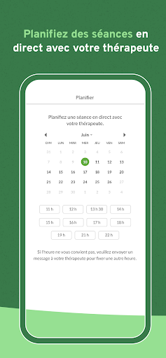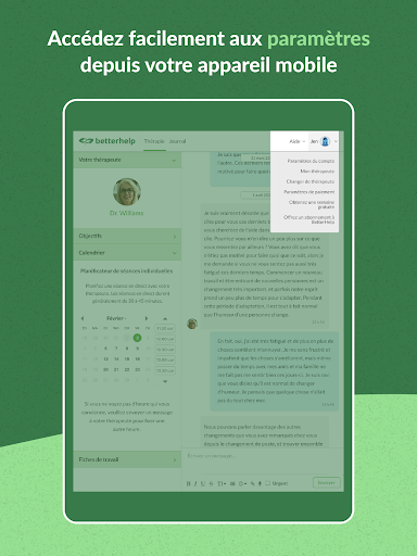 BetterHelp est le moyen le plus pratique d\obtenir l\aide professionnelle d\un thérapeute qualifié. Avec plus de 30 000 thérapeutes formés, expérimentés et qualifiés dans le monde entier, couvrant un large éventail de domaines – de la dépression et de l\anxiété à la thérapie familiale et de couple – il n\a jamais été aussi facile de recevoir une aide personnelle et professionnelle lorsque vous en avez besoin. ----------------------------------------- BETTERHELP – CARACTÉRISTIQUES ----------------------------------------- • Plus de 30 000 thérapeutes qualifiés et très expérimentés dans le monde entier. • Trouvez le thérapeute qui vous convient en fonction de vos besoins, de vos préférences et de votre lieu de résidence. • Envoyez un message à votre thérapeute aussi souvent que vous le souhaitez. • Planifiez des séances en direct avec votre thérapeute ou utilisez la messagerie avec un niveau de sécurité élevé. UNE AIDE PROFESSIONNELLE ADAPTÉE À VOS BESOINS Faire face seul à des obstacles peut être décourageant. Il a été démontré que le fait de recevoir le soutien et les conseils d\un thérapeute professionnel peut entraîner des changements positifs considérables et vous aider à surmonter vos difficultés personnelles. Lorsque vous vous inscrivez, nous vous mettons en correspondance avec un thérapeute disponible en fonction de vos besoins, de vos préférences et de votre lieu de résidence. Les thérapeutes ont des approches et des domaines d\expertise différents, c\est pourquoi nous travaillerons avec vous pour trouver la bonne personne qui pourra obtenir les meilleurs résultats pour vous. DES THÉRAPEUTES QUALIFIÉS ET FORMÉS BetterHelp compte plus de 30 000 thérapeutes dans le monde. Tous nos thérapeutes ont un diplôme pertinent dans leur domaine, au moins trois ans d\expérience, et doivent être qualifiés par leur organisation professionnelle respective après avoir réussi les études, les examens, la formation et les exigences de pratique nécessaires. Nous renvoyons aux thérapeutes à travers nos sites et nos applications en fonction de leur titre professionnel et de leurs qualifications, spécifiques aux États-Unis, au Royaume-Uni, à l\Australie, à l\Allemagne, à la France ou aux Pays-Bas, selon le cas. COMMENT CELA FONCTIONNE-T-IL ? Après avoir rempli notre questionnaire, vous serez mis en correspondance avec un thérapeute qualifié en fonction de vos besoins, de vos préférences et de votre lieu de résidence. Vous et votre thérapeute disposerez de votre propre « salle de thérapie », où vous pourrez envoyer des messages à votre thérapeute à tout moment, à partir de n\importe quel appareil connecté à Internet, où que vous soyez. Vous pouvez également programmer une séance hebdomadaire pour parler en direct avec votre thérapeute par vidéo ou par téléphone. Vous pouvez écrire ou parler de vous, de ce qui se passe dans votre vie, poser des questions et discuter des défis auxquels vous êtes confronté, et votre thérapeute vous fera part de ses commentaires, de ses idées et de ses conseils. Ce dialogue individuel continu est la base de votre travail avec votre thérapeute. Ensemble, vous vous efforcerez d\apporter des changements positifs à votre vie, d\atteindre vos objectifs et de surmonter vos problèmes. COMBIEN CELA COÛTE-T-IL ? Le coût de la thérapie par BetterHelp varie entre 50 et 70 € par semaine (facturé toutes les quatre semaines), mais il peut être plus élevé en fonction de facteurs tels que votre lieu de résidence, vos préférences et la disponibilité du thérapeute. Votre abonnement à BetterHelp comprend des vidéos, des messages audio, des séances hebdomadaires en direct, et vous pouvez envoyer un message à votre thérapeute à tout moment. L\abonnement est facturé et renouvelé toutes les quatre semaines et comprend tant l\utilisation du site avec une sécurité renforcée que le service de thérapie proprement dit. Vous pouvez annuler votre abonnement à tout moment pour n\importe quelle raison.
