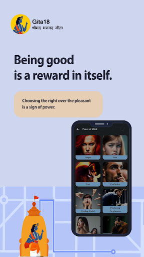 Experience the Divine Wisdom of the Bhagavad Gita Anywhere, Anytime! Bhagavad Gita is a part of the 5th Veda (written by Vedavyasa - an ancient Indian saint) and the Indian Epic - Mahabharata. It was narrated for the first time in the battle of Kurukshetra, by Lord Krishna to Arjun. The Bhagavad Gita is a special book from Hindu scripture. It has 18 parts called chapters and around 700 small sections called verses. In the book, there\s a conversation between a prince Arjuna, and a wise person named Krishna, who is also his guide. They talk about important things like how to make good choices and how to live a meaningful life. The Bhagavad Gita teaches us about duty, being kind, and finding our true selves. It\s like a guide for living well. Carry the profound teachings of the Bhagavad Gita in your pocket with the \Bhagavad Gita: Gita18\ app. This beautifully designed and user-friendly app offers complete translations of the Bhagavad Gita in English, Hindi, Gujarati, Tamil, Telugu, and Odia making it your ideal companion for spiritual growth. Key Features: Reading Tracker: Seamlessly continue your reading journey from where you left off. The app keeps track of your progress, ensuring an uninterrupted and enriching experience. Multi-language Support: Whether you prefer language this app caters to your language preference. It offers 6 language supports like English, Hindi, Gujarati, Tamil, Telugu, and Odia translations in one place. Bookmark: In the Bhagavad Gita app, you can mark many spots of bookmark on verses as you like, so you can find them easily later. This makes reading even easier and more helpful. Detailed Explanations: Delve into the depths of the Bhagavad Gita with our comprehensive verse-by-verse commentary. Gain a deeper understanding of the context, philosophy, and practical applications of each verse. We are trying to explain each and every verse in depth with what this verse teaches us. Listen Verse: Choose how fast or slow you want to recite verses using our special feature. Listen to the audio for each verse and change the speed as you like. Follow along easily with a moving highlight that helps you read each verse smoothly and enjoyably. Listen and Learn Explanations: Let the app tell you about each verse. Hear descriptions and teachings that help you understand the meaning better. It\s like having a wise friend guide you through the verses. Discover Inner Peace of Mind: When emotions like Anger, Fear, Lust, Confusion, feeling sinful, Practicing Forgiveness, Dealing with envy, Forgetfulness, Pride, Death of a Loved One, Greed, Seeking Peace, Demotivated, Laziness, Temptation, Depression, Loneliness, Uncontrolled Mind, Discriminated or Losing Hope arise in your mind our app offers verses that can soothe your heart. It\s like having a toolbox of comforting words for when things get tough. Chant Together for Good Vibes: Join the chant of the powerful mantra \श्री कृष्ण शरणम मम:\ with others in real-time. See the global count of chants. Let\s aim to chant it billions of times together and spread positivity everywhere. Thoughtful Thinking: As you discover the teachings of the Gita, you can think deeply about them and how they relate to your life.You can choose which parts of the Gita you want to learn about. If you\re interested in things like your responsibilities, being good, or feeling calm inside, our app, Gita18, can help you with that. Discover the Gita18 app where ancient wisdom meets technology. It helps you feel closer to the teachings of the Bhagavad Gita in an easy and modern way. Start your journey today, and let\s make each chant a step towards a happier and more connected world. • Bhagvadgita Gita • Bhagvadgita Gita: Gita18 • Gita18 • Gita 18 • Gita • Bhagvadgita Gita in English • Bhagvadgita Gita in Hindi • Bhagvadgita Gita in Gujarati • Bhagvadgita Gita in Tamil • Bhagvadgita Gita in Telugu • Bhagvadgita Gita in Odia