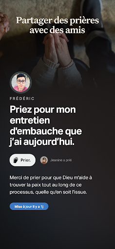 Il est difficile de rester centré sur Dieu et Sa Parole. C\est pourquoi la Bible App YouVersion gratuite vous donne des outils pour rechercher quotidiennement le cœur de Dieu: écoutez des Bibles audio, créez des prières, étudiez avec des amis, explorez plus de 2000 versions bibliques, et bien plus encore. Maintenant sur plus de 400 millions d\appareils dans le monde! Accédez à tout en ligne, ou téléchargez des versions sélectionnées pour les lire hors ligne. Créez des listes de prière et priez dans un but précis. Personnalisez votre Bible avec des surbrillances, des favoris, des badges, et des notes. Lisez, étudiez et partagez avec vos amis. Partagez des conversations sincères à propos de la foi. Rapprochez-vous de Dieu avec vos amis et partagez vos découvertes. Créez des versets bibliques partageables et ajoutez des versets bibliques à vos photos. FAITES DE LA PRIÈRE UNE HABITUDE QUOTIDIENNE - Utilisez des cartes de prière pour avoir un suivi de vos prières dans la Bible App. - Organisez facilement des listes de prière. - Gardez vos prières privées ou partagez-les avec vos amis. - Célébrez les réponses aux prières avec vos amis de la Bible App. PERSONNALISEZ VOTRE BIBLE GRATUITE - VERSETS ILLUSTRÉS: Créez des images étonnantes de versets bibliques. - SURBRILLANCES: Sélectionnez des couleurs personnalisées. - FAVORIS: Mémorisez et trouvez vos versets bibliques préférés. - NOTES: Privé: vous seul pouvez les voir, ou Public: à partager avec vos amis. - Partagez des versets avec vos amis: réseaux sociaux, e-mail, ou SMS/texto. - CLOUD SYNC: Avec le compte YouVersion gratuit, retrouvez vos notes, surbrillances, favoris et plans à lire sur tout appareil pris en charge. - LECTURE FACILE: Ajustez les paramètres tels que les polices, l\espacement et la taille du texte, et lisez même en mode sombre. LISEZ LA BIBLE CHAQUE JOUR - Découvrez la Bible App dans plus de 65 langues. - Naviguez entre plus de 2 000 versions de la Bible dans plus de 1 300 langues. - Versions populaires: NFC, BFC, BDS, BCC, LSG, NBS, la version Second 21(S21), et plus encore. - Bibles hors ligne: lisez hors ligne sans accès au réseau (certaines versions). - Bibles audio: Audio pour certaines versions (non disponible hors ligne). - Fonctionnalité verset du jour. ÉTUDIER LA PAROLE DE DIEU - Plans de lecture: Des milliers de dévotions, de plans bibliques. - Lisez des parties de la Bible ou des sujets d\étude biblique. - Lisez toute la Bible (à la fois la Bible en une année et la One Year Bible). - Vidéo: Regardez des extraits du film JÉSUS, The Bible Project, Lumo Project et plus. CONNECTEZ-VOUS AVEC DES AMIS - Centrez vos amitiés autour de la Sainte Écriture dans Bible App. - Flux d\accueil: découvrez les favoris et les surbrillances de vos amis. - Commentaires: Connectez-vous avec des amis en étudiant ensemble les vérités bibliques. - Partagez vos idées, posez des questions. SE CONNECTER AVEC YOUVERSION - Contactez le support technique directement depuis Bible App. - Rejoignez la communauté @youversion sur Instagram, Facebook et Twitter - Tenez-vous au courant des dernières nouveautés sur blog.youversion.com - Accédez à la Bible en ligne sur bible.com Téléchargez maintenant l\application biblique numéro 1 et découvrez cette expérience de lecture unique utilisée par des millions d\utilisateurs! Plus de 1000 versions comprenant: Bible Segond 1910 LSG Bible Parole de Vie PDV Bible Segond 21 La Bible en français courant Bible catholique Crampon 1923 La Bible du Semeur Martin 1744 Bible Darby en français Nouvelle Bible Segond Nouvelle Edition de Genève 1979 Ostervald Ecoutez les versions audio, comprenant: Bible Parole de Vie PDV Bible Segond 1910 LSG Bible catholique Crampon 1923