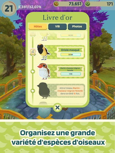 As-tu déjà rêvé d\abandonner le train-train quotidien, et peut-être même d\avoir ton propre Bed and Breakfast ? Lance-toi dans la conception de ton BnB et prends soin d\hôtes originaux pour qu\ils te laissent une évaluation de 5 étoiles ! Plus ta note est élevée, plus tu déverrouilles de chambres et attires de clients ! Collectionne leurs photos dans ton livre d\or ! Oh, et avons-nous mentionné que tes clients sont des oiseaux ? Et que tu peux passer en RA (réalité augmentée) et voir tes amis à plumes apparaître chez toi ? Dans Bird BnB, tu rencontreras Pepper et Mango, tes guides charismatiques dans le monde du BnB ! Elles auraient bien besoin d\un coup de main pour transformer un vieil arbre vide en destination hôtelière pour voyageurs à plumes. Caractéristiques du jeu - Construis ton BnB pour oiseaux dans un arbre au cadre paisible. - Conçois son design en fabriquant les nids, nichoirs et autres meubles de ton choix. Chaque arbre est unique ! - Fais pousser un jardin pour fournir le petit déjeuner à tes hôtes et utilise tes talents de designer pour décorer ton arbre avec les équipements dont ils ont besoin afin d\atteindre la note tant convoitée de 5 étoiles. - Plus tes évaluations seront bonnes, plus tu auras de visiteurs hauts en couleurs à chouchouter et à collectionner dans ton livre d\or ! - Tous les oiseaux sont basés sur de véritables espèces du monde entier et de vrais chants sont inclus pour chacun d\entre eux ! - Découvrez les VIB (Very Important Birds), ces oiseaux célèbres aux noms uniques et aux profils amusants. - Ce jeu propose une option réalité augmentée ! Si tu veux vivre un moment magique avec tes amis à plumes, passe en mode RA et observe tes oiseaux sautiller juste devant toi, où que tu sois ! Peux-tu prendre une photo de tes amis oiseaux avec ton véritable animal de compagnie ? Prends une photo dans ton salon, sur une terrasse, dans un parc ou près d\un monument connu ! Bird BnB est un jeu gratuit qui offre la possibilité d\acheter des objets en jeu. Tu peux arrêter la fonctionnalité de paiement en désactivant les achats en jeu dans les paramètres de ton appareil. Chez Runaway Play, nous espérons sincèrement que tu aimeras ce jeu autant que nous. Si tu rencontres un problème pendant que tu joues ou que tu as des suggestions, n\hésite pas à nous contacter à l\adresse support@runawayplay.com