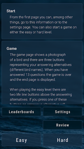 ● Choose to display the bird names in one out of 27 different languages. ● Enjoy 979 beautiful original photographs of birds. ● Keep the game challenging by adjusting the level of difficulty. ● Use the leaderboards to compete with other bird lovers. With its two levels of difficulty the quiz suits experienced ornithologists as well as beginners of birds. The easy level contains lifelines that allow you to delete an incorrect species name. The difficult level, on the other hand, has no lifelines and the answers are more similar. All photographs are of wild birds in Europe. Taxonomy and species names are continuously updated according to the bird list from the international ornithological committee. There is a free version, Little Bird Quiz: Aves Europe. Try it first!