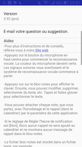 Fonctionnalités: - Il suffit d\une seule touche. Il peut continuellement recevoir votre voix pour convertir en texte et noter et vous rappeler plus tard. - Prenez facilement des notes, des mémos, une liste de choses à faire et bien plus encore simplement en parlant ! - Intégré avec votre calendrier Android, vous n\avez pas besoin de maintenir un autre. - Sauvegardez automatiquement vos notes dans votre fichier de stockage, et facilement sauvegarder dans le nuage. - Prise en charge de la création de fichiers de notes par projets ou catégories. - Cela peut fonctionner lorsque l\écran du téléphone est éteint. - Facile pour partager voix-vers-texte pour les amis. - Prend en charge 120 langues de reconnaissance vocale - Supports de 20 langues d\interface utilisateur (y compris le français) - Support du kit oreillette pour contrôler la reconnaissance vocale Start/Stop - Interface utilisateur simple et facile. Il suffit d\appuyer sur le bouton du microphone et de parler pour prendre note! Exigences: - La recherche Google Voice (application Google) v6.15.24.21 ou ultérieure est nécessaire en tant que moteur de voix à texte. La plupart des périphériques l\ont préinstallé. Si vos appareils ne l\installent pas, cette application vous guidera à installer. https://play.google.com/store/apps/details?id=com.google.android.tts https://play.google.com/store/apps/details?id=com.google.android.googlequicksearchbox Avis d\autorisation: Cette application demande éventuellement des autorisations pour accéder aux fonctionnalités suivantes. • Microphone pour la reconnaissance de la parole • Calendrier pour ajouter un événement de rappel