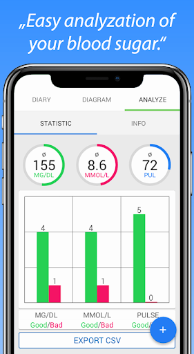 This extensive Blood Sugar Diary provides you all functions you need to record, track and analyze your blood sugar and pulse. Since this data is very sensitive, we offer you a high level of data protection. Therefore, your health data is stored only where it belongs: on your device! Key features: - Offline Modus (You don\t need an internet connection) - High level data protection - A beautiful design ensures your daily well-being in the app - Quick and easy capture of your blood sugar and pulse data - Add notes or tags to your data (for example: after morning workout, forgotten to take medications) - A great and clear diary for your blood sugar and pulse - Extensive diagrams and statistics to track your data over long periods of time - Add events to your calendar and be reminded of them - Export your data as a CSV-File - Much information about different blood sugar levels - No registration needed Start your personal and free Blood Sugar Diary now! Disclaimer: This app is created to provide you a great diary for your blood sugar and pulse and does not measure your blood sugar and pulse. All result values are random generated!