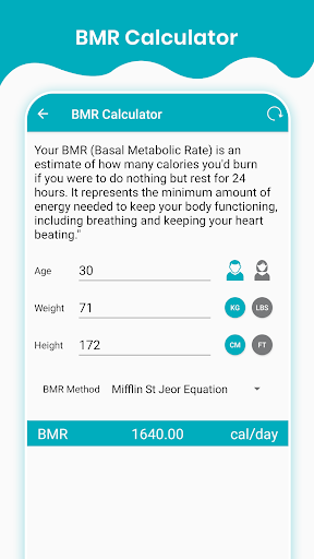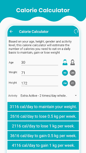 Top features of this free BMI Calculator & Ideal Weight - Calorie Calculator: BMI Calculator BMR Calculator Ideal Weight Calculator Water Intake Calculator Calorie Calculator Nutrients Calculator What is BMI Calculator? BMI Calculator is free app that allows you to Calculate BMI and whether it falls in normal category. BMI Calculator formula options: Standard BMI formula: For all over the world this formula has been used for ages and universally accepted. Earlier all medical professionals have used this formula to evaluate a person health parameters. New BMI formula: Recently new formula has been identified which shows more realistic result based on the height, the New BMI formula is more accurate than the basic standard formula. BMR Calculator Basal metabolic rate (BMR) is the total number of calories that your body needs to perform basic, life-sustaining functions. If you want to lose weight, it\s helpful to calculate your BMR. You can either find the number using a formula designed by scientists, you can get it tested in a lab. Ideal Weight Calculator Ideal weight - App calculates the ideal weight you should have according to your Physical attribute. Calorie Calculator Calculates how many calories you need to maintain your weight according to the physical activities your doing on daily basis. Water Intake Calculator Calculates How much is the suggested water Intake according to your body weight. Nutrient Calculator This nutrient calculator provides composition of protein, carbohydrate and fat according to your height, age and body weight. Age Calculator Age Calculator calculates age in Years, Months, Weeks, Days, Hours, Minutes, and even in Seconds.You can find out how many Month and days to go for your next birthday. Weight Tracker Weight Tracker will help you to track your body weight. Day to Day tracking of weight keeps you motivated to lose weight. Chart and statistics help to find out what diet plan works for you. Weight Tracker Features: Track your daily weight. Analyze your weight history in various charts and visualizations to gain insights on the way to a better body image Set a desired weight and follow your progress Take a look on statistics about your weight, average weight. Hurry Get the free BMI Calculator App and learn more about your ideal weight and many more vital health parameters.️️️️