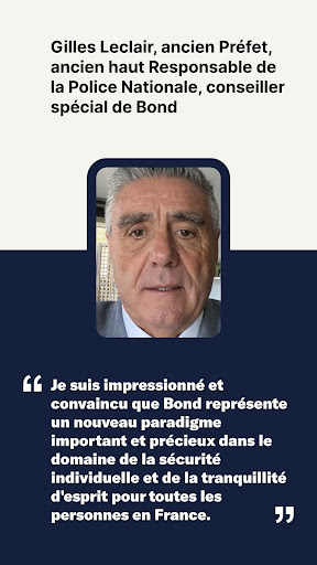 Bond est Votre Compagnon de Sécurité Personnelle avec la mission de créer un monde plus sûr. Se sentir plus en sécurité n’a jamais été aussi simple. Les services de sécurité de Bond ont été créés dans le but d’offrir à vous et à vos proches, où que vous alliez, plus de confiance et de tranquillité d’esprit. Notre application offre une gamme complète de services répondant à l’ensemble des préoccupations de sécurité que vous avez au cours de votre journée. Bond surveille de près les situations inconfortables ou coordonne avec les services d’urgence en votre nom en cas d’urgence. Chaque fois que vous vous sentez en danger, utilisez l’un de nos services de prévention ou appuyez pour vous connecter à notre Centre de Commande par chat, vidéo ou appel. Un Agent certifié est là pour vous aider 24h/24 et 7 j/7. Toujours à vos côtés. Toujours prêt. Bond est votre compagnon de sécurité disponible 24h/24 et 7j/7. Services Gratuits : 1. Services de Localisation : Gardez un œil sur vos proches en utilisant nos services de localisation afin d’être au courant où se trouvent à tout moment vos contacts sur la carte. 2. Sirène (sans Agent) : Si vous cherchez à attirer l’attention à votre situation, appuyez en continu, pendant 3 secondes, le bouton de Sirène afin d’activer un bruit fort et une lumière clignotante. 3. Les Services d’Urgence : Nous ne remplaçons pas les services d’urgence. En cas d’urgence, vous pouvez appuyer sur le bouton de services d’urgence afin de vous connecter aux autorités. Vous serez connecté par les services d’urgence locaux. Services Premium : 4. Agents disponibles 24h/24 et 7j/7 : Si vous vous sentez mal à l’aise ou en danger, connectez-vous avec un Agent en direct via chat, appel ou vidéo afin d’obtenir des conseils de sécurité. Disponible 24h/24 et 7j/7. 5. Affecter un Agent : Si vous vous sentez en danger et voulez mettre un Agent en attente, appuyez sur Affecter un Agent. 6. Surveiller Mon Trajet : Si vous vous sentez nerveux ou que vous vous trouvez dans un endroit inconnu, activez Surveiller Mon Trajet et nos Agents avec nos technologies vous surveilleront pendant que vous marchez, conduisez, faites du vélo ou utilisez un transport en commun. Nous veillerons à ce qu\il n\y ait aucune déviation le long de votre itinéraire. En cas de changements ou de retard dans votre arrivée à votre destination prévue, nous prendrons contact avec vous pour vérifier votre sécurité. 7. Vidéo Surveillance : Chaque fois que vous vous sentez mal à l’aise quelque part, appuyez simplement sur Vidéo Surveillance et un Agent sera instantanément à vos côtés pour vous accompagner par vidéo en direct. 8. Test de Sécurité : Programmez des tests virtuels afin de vérifier votre sécurité ou celle de quelqu’un d’autre. 9. Sirène (avec un Agent) : Si vous cherchez à attirer l’attention sur votre situation, appuyez en continu, pendant 3 secondes, le bouton de Sirène afin d’activer un bruit fort et une lumière clignotante. Si vous ne désactivez pas la Sirène dans 10 secondes, vous serez connecté à un Agent. Bond est ici 24h/24 et 7j/7 pour que vous et vos proches sentiez plus en sécurité. Pour en savoir plus, allez sur www.ourbond.com/fr. Les services de Bond sont utilisables à partir de 13 ans (de 13 à 17 ans l’autorisation parentale est nécessaire). Vous pouvez lire nos Conditions d’Utilisation ici : https://www.ourbond.com/fr/terms-of-use/. Chez Bond votre sécurité est extrêmement importante pour nous. Vos données sont uniquement utilisées pour assurer une sécurité accrue. Nous respectons les normes et les exigences les plus strictes du traitement et de la protection des données personnelles. Nous ne transmettons jamais vos données. Vous pouvez lire notre Politique de Confidentialité ici : https://www.ourbond.com/fr/privacy-policy/