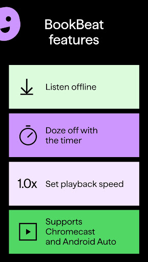 With BookBeat, you can easily enjoy more than 1 million books, right at your fingertips. We have audiobooks and e-books in all genres, and they’re available to you at any time. Try for free and find your next book today! We have new releases and classics in English as well as German, Spanish, French, Italian, Swedish, Finnish and other languages. Listen to an exciting thriller or read an interesting biography and find your next book with our inspiring tips and top lists. You can even download books to your device, so you can enjoy a great story when you don\t have mobile data or wi-fi. If you are going on a road trip, you can use BookBeat with Android Auto. How to get started: 1. Create an account on our website www.bookbeat.com 2. Download the BookBeat app and log in 3. Start listening to thousands of audiobooks right on your mobile After your free trial, your subscription will automatically continue. BookBeat has no commitments, you can cancel your account whenever you’d like. More About BookBeat: • Free trial • Sign up and get started in just a few steps • Choose how much you want to listen and read each month based on your selected package. • Family account with up to 5 profiles. • Switch to a children\s profile and get content tailored for kids in the app. • Stream or download audiobooks and E-books to listen and read offline • Place a bookmark in your audiobook and add a note to easily find your favorite part again • Use the timer function before bed • Choose your own playback speed and skip intervals • Share your book tips with your friends via social media • Discover your listening and reading habits with our User Statistics feature and share your stats with friends. BookBeat supports: • Smartphones • Tablets • Chromecast • Android Auto • Chromebook • Dark Mode • TalkBack and accessibility functions We love feedback from our customers! If you have new ideas, opinions or problems you’d like to share, reach out via e-mail at feedback@bookbeat.com.