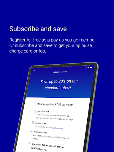 Get energy effortlessly when you’re charging on the go with the bp pulse app. Our network is one of the Uk’s largest – with more than 9,000 EV charging points. Register on the app and upgrade to a bp pulse subscription to: • Unlock your special free offer, 1 month free subscription* • Pay 20% less** than when you Pay as You Go with our best on the go charging tariff. • Order a bp pulse charge card if you’d prefer a different way to start your charge. Or register as a free Pay as You Go user and simply add a payment card within the app wallet to get started. Both Subscribers and Pay as You Go users can use the app too: • Start and stop a charge • Save your favourite charging points on our live map • Find available electric vehicle charging stations • Filter by connector type and kW speed • Check charging history and download VAT receipts Whether you’re shopping for groceries, travelling or staying in a hotel – plug in, power up and go with the bp pulse app. * Subscription is £7.85 a month collected via your chosen payment card from the second month. T&Cs of the network apply. **Pay on average 20% less than Contactless rates when using chargers on our standard price tariffs within the bp pulse network as available here. Savings vary by charger type (Fast = 25%, Rapid = 20%, UFC = 19% less). Rates & average subscriber savings are subject to change. bp’s here for your travel needs – mostly with petrol and diesel – but bp pulse already has over 3,000 rapid and ultra-fast charging points.