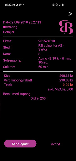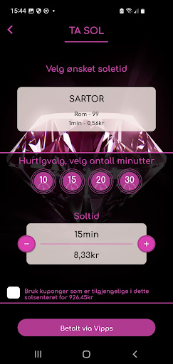 Brun og blid Vipps Solpass er en ny applikasjon som tillater å betale for soltiden ved hjelp av Vipps betaling. Ny og forbedret aldersbekreftelse med Vipps vil gi en enklere og mer effektiv betalingsmåte, i tillegg til raskere respons. Du vil få 20 % ekstra solingstid når du bruker denne appen. Skann QR-koden enkelt og med enkel navigering i appen kan du kjøpe soltid med bare noen få steg. Betalings- og aldersbekreftelse vil bli utført ved hjelp av Vipps. Du må derfor ha Vipps allerede installert på telefonen. Ingen ytterlige ID-verifikasjon er nødvendig. Solappen inneholder funksjoner som: Kuponger for ekstra rabatter fra kundeservice. Detaljert oversikt over tidligere soltimer inkludert tid og beløp. Betaling med Vipps.