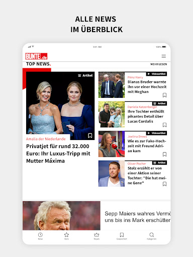 Willkommen bei der brandneuen BUNTE.de App! Du liebst aktuelle News und möchtest keine Neuigkeiten über deine Lieblingsstars, Royals und Promis verpassen? Dann ist unsere neue App genau das Richtige für dich! Mit BUNTE.de erlebst du Celebrities hautnah. Unsere App bietet dir alles, was du dir wünschst. Du erhältst Push-Nachrichten zu den wichtigsten Nachrichten und bist immer auf dem Laufenden. Die Inhalte werden nun neben dem bekannten Artikel-Format auch im modernen Fullscreen Story Format präsentiert, sodass du schnell und bequem die neuesten News und Geschichten über Stars und Royals konsumieren kannst – ganz wie du möchtest. Freue dich auf ein modernes Design und entdecke alle deine Lieblingsthemen aus den Bereichen Stars, Royals, Entertainment, Beauty, Fashion, Health und Family sowie alle News im Überblick. Außerdem erwarten dich exklusive Inhalte nur für die App und spannende Gewinnspiele. Lade dir jetzt die neue BUNTE.de App herunter und tauche ein in die Welt der Stars, Royals und Promis. Erlebe News, Promi-Geschichten und VIP-Insider-Wissen wie nie zuvor. Deine tägliche Dosis Unterhaltung ist nur einen Klick entfernt. Hole dir die App und genieße eine Auszeit vom Alltag! HINWEISE ZUR APP Der Inhalt der BUNTE.de App weicht von den Inhalten des BUNTE Print-Magazins sowie der Magazin-App ab. Die BUNTE-Magazin-App bietet aktuelle & zurückliegende Ausgaben der BUNTE und stellt diese auch kostenlos zum Download zur Verfügung. Die BUNTE.de App gefällt dir? Dann bewerte sie im App Store, wir freuen uns über deine positiven Eindrücke. Es gibt noch weitere Features, die du dir wünscht? Dann schreib uns unter: support.bunte-online@burda.com Wir freuen uns über dein Feedback! Das BUNTE.de-Team