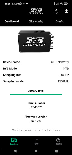 BYB Telemetry detects the motion of your suspension, the brakes usage, the speed and other dynamic parameters while riding. Through this app is possible to manage the settings of the BYB telemetry v2.0 system. It\s also possible to download and visualize the acquired data, push them directly to your PC and consult user and software manuals.
