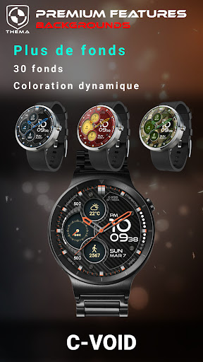 C-Void Watch Face pour Wear OS ! Vous n\avez pas de montre Wear OS ? Vous pouvez malgré tout utiliser ce cadran comme widget d\horloge sur votre mobile ! ️PAS POUR SAMSUNG GEAR S2 / GEAR S3 !! (sous Tizen OS)️ Si vous en avez une, n\installez pas cette application. Pour trouver les applications compatibles avec votre montre, ainsi que du support, allez sur http://www.themaapps.com/watch_on_tizen_os ★ Fonctionnalités de C-Void Watch Face ★ - Widget d\horloge (Seconde non affiché pour raison d\autonomie de batterie) - Choix de couleur du design - Jour & Mois - Batterie de la montre - Batterie du téléphone - Météo (nécessite l\appli mobile) Les réglages du cadran sont situés dans l\application \Wear OS\. Touchez simplement l\icone crantée affichée sur l\aperçu du cadran pour accéder à l\écran de réglage ! ★ Réglages FREE ★ - Choix de couleur du design sur la montre et le téléphone - Délai de rafraichissement de la fréquence cardiaque - Délai de rafraichissement de la météo - Unité de température - Mode 12 / 24 heures - Définition de la durée du mode interactif - Choix de la luminosité du mode ambiant n&b et éco - Choix d\avoir un zéro sur les heures - Choix d\afficher ou non les points représentant les secondes ★ Réglages additionnels FREE sur mobile★ - Choix entre les notifications Wear petites/grandes/transparentes/opaques (Wear 1.5x uniquement) - Choix parmi 2 fournisseurs de météo (Yr & OpenWeatherMap) ★ Réglages PREMIUM - Choix du mode ambiant : éco, simple n&b, complet - Choix du fond parmi les différents styles - Coloration du fond dynamique - Choix de votre propre nom au lieu de C-VOID - Définition d\une seconde timezone pour l\affichage digital - Data: + Choix de l\indicateur à afficher sur les 3 emplacements + Choix parmi 8 indicateurs (Compteur de pas journalier, Fréquence cardiaque, E mail de Gmail non lus, etc...) + Complication (wear 2.0) - Interactivités + Accès à un écran de données détailles pour chaque donnée disponible + Modification par simple touché de la donnée affichée parmi les 8 données disponibles. + Choix du raccourcis à afficher sur les 4 emplacements + Choix du raccourcis parmi l\ensemble des applications installées sur votre montre! + Choix d\afficher les zones interactives - Gestionnaire de préréglages: + Sauver votre préréglage avec toutes ses options (couleurs, fonds, données, fonctionnalités. TOUT est sauvé!) + Charger / Supprimer l\un de vos préréglages précédemment sauvés + Partager / Importer des préréglages - Définition manuelle ou automatique de la position ★ Installation ★ Watch Face Wear OS 1.X Ce cadran sera installée automatiquement sur votre montre via votre téléphone appairé. Néanmoins, si ce n\était pas le cas, lancer l\application Wear OS et aller dans les Réglages, puis appuyez sur \Resynchroniser les applications\. Wear OS 2.X Une notification sera affichée sur votre montre suite à l\installation mobile. Il vous suffira de l\utiliser pour démarrer l\installation du cadran. Si toutefois la notification n\avait pas été affichée, vous pouvez toujours installer le cadran en utilisant le Google Play Store disponible sur votre montre, en le recherchant par son nom. Widget mobile Il vous suffira d\effectuer un appui long sur l\écran de votre mobile, puis de sélectionner le widget correspondant au cadran pour le placer sur l\écran de votre mobile. Effectuez les réglages du widget en utilisant l\application. ** Si vous rencontrez des problèmes ou souhaitez simplement poser une question, n\hésitez pas à me contacter par mail (Anglais ou Français) avant de mettre une mauvaise note à l\appli :) Merci ! Website: http://www.themaapps.com/ Youtube: https://youtube.com/ThomasHemetri Twitter: https://twitter.com/ThomasHemetri Instagram: https://www.instagram.com/thema_watchfaces